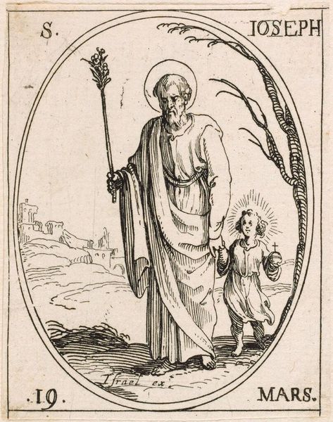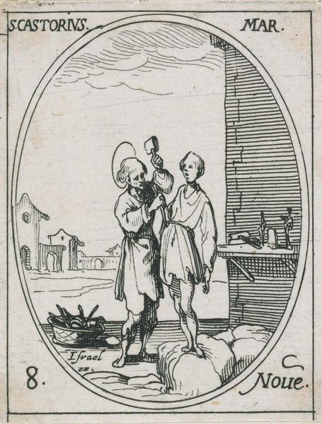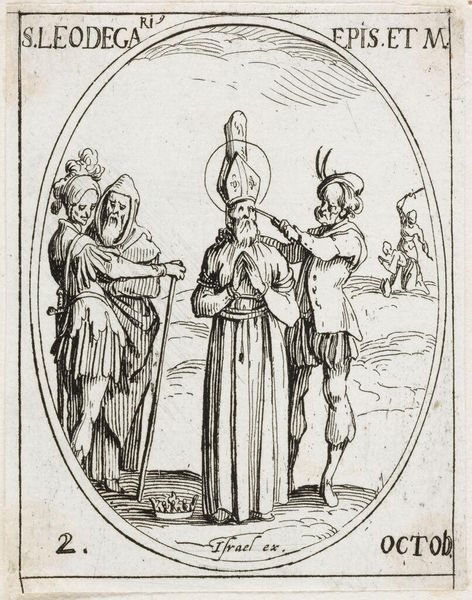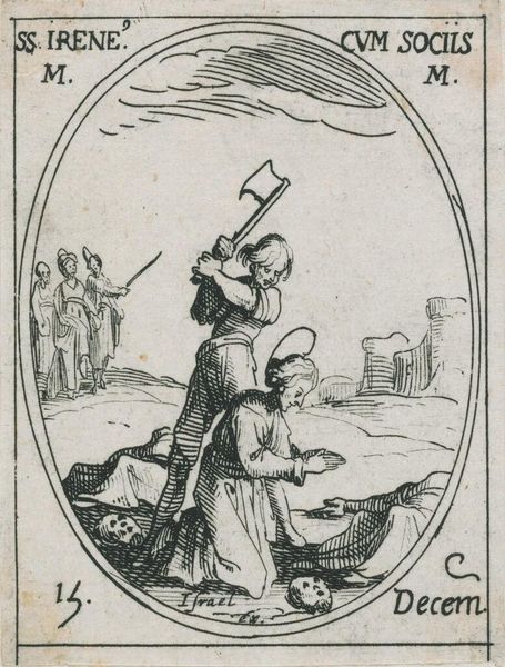 Editor: This is Jacques Callot's "Saints Chrisantus and Daria," a small etching. It depicts a rather violent scene, but the saints appear serene. What symbols stand out to you? Curator: Note the stones being cast, a clear reference to martyrdom, a powerful symbol of faith under duress. Consider how the halo, a visual signifier of sanctity, contrasts with the brutality of the act. Editor: So, the halo is not just decorative? Curator: Precisely. It’s a visual cue linking them to a legacy of unwavering belief despite persecution. These symbols carry centuries of emotional and cultural meaning. Editor: I see how Callot uses symbols to communicate a bigger idea. Curator: Indeed. By understanding their symbolic weight, we can see how art serves as a cultural memory, connecting us to the past.