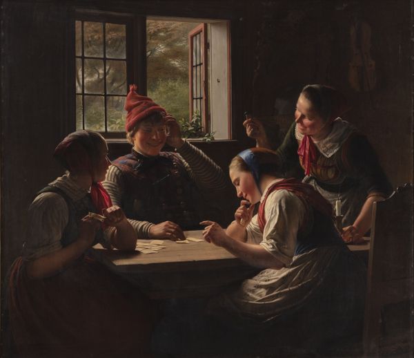 Editor: This is Anna Ancher’s “Plucking the Geese,” painted in 1904. It’s an oil on canvas and gives such a grounded sense of everyday life. What strikes me is the repetitive gesture across the canvas - what do you see in how Ancher uses this rhythm to organize the composition? Curator: Formally, it’s quite intriguing. The horizontal arrangement of the figures creates a frieze-like effect, emphasizing the rhythmic, almost ritualistic action of plucking. Note the strategic use of light – it falls predominantly on the geese and hands, directing our gaze to the labor itself, which becomes the focal point. Consider how the textures are built using visible brushstrokes and layers of paint, giving the piece a palpable materiality. Editor: I see what you mean. The repetition is definitely key to the rhythm and movement. So, are you suggesting the visual qualities create a specific understanding of this common work? Curator: Precisely. The emphasis on line, texture, and composition over realistic details shifts the focus from merely representing a scene to conveying a deeper, almost choreographic representation of labor. The restricted palette reinforces this, creating a cohesive visual experience rather than a stark documentary depiction. Ask yourself how the painting uses formal elements to reveal something profound about everyday life and the communal act of labor. Editor: It’s fascinating how closely observing the formal elements transforms the act of plucking geese from the mundane to something almost stately. I hadn’t considered the choreography inherent in that scene until now. Curator: Indeed. Ancher prompts us to view the ordinary with renewed attention, highlighting the beauty and quiet dignity of daily life through the thoughtful manipulation of visual forms. Editor: That's given me a lot to think about. I will now be observing paintings very differently.