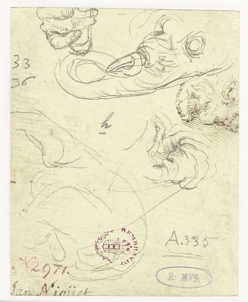 Editor: So, here we have "Ontwerp voor vat gedragen door twee figuren en vijf schelpvormige vaten" by Henri Camere, dating from between 1864 and 1894, rendered in pencil. I find this work somewhat perplexing. The juxtaposition of human figures and shell-like forms feels oddly playful, but also a little obscure. What jumps out at you? Curator: Oh, this! This isn’t just a drawing, you know. It's more like a daydream scribbled onto paper. I can almost feel Camere, lost in thought, doodling these whimsical forms. See how the lines aren’t rigid, precise? It gives the sense he’s more interested in the *idea* of these ornate vessels, these muscular figures, than any sort of precise representation. Like catching fireflies in a jar—you’re after the light, not the perfect insect. Editor: That's a lovely image. So it’s less about function and more about, dare I say, fantasy? Curator: Exactly! It's pure invention, wouldn't you agree? Imagine those vessels filled with wine or some potent potion, brought forth at some sort of decadent feast! And those figures... part Atlas, part impish sprite! He has a beautiful balance of robust masculinity and something much softer. I suspect Camere was less interested in actual, buildable designs, and more in conjuring a sense of baroque excess. What do *you* think he's saying with that blend of delicacy and grandeur? Editor: Perhaps that beauty can be found even in the most mundane, practical objects. Even a wine vessel can be a source of artistry. Curator: Or perhaps a barrel can aspire to the heavens! What have *I* learned today? Never underestimate the power of a humble pencil sketch.