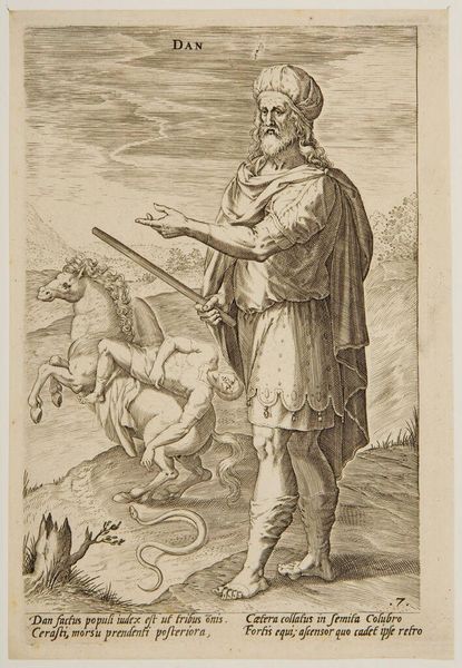 This engraving, titled 'Koning Artaxerxes III', resides in the Rijksmuseum, though the artist remains anonymous. The print presents us with a commanding figure, Artaxerxes, rendered through a network of fine, precise lines. The composition is structured to emphasize Artaxerxes' dominance. He strides forward, sword aloft, a symbol of authority and power. The artist uses scale to reinforce this, dwarfing the figures in the background, which includes a city and group of soldiers. The lines create texture and volume, particularly in the rendering of fabric and musculature. The cloak drapes with heavy folds, creating a play of light and shadow that adds depth. The landscape behind him, with its carefully etched hills and buildings, provides a stage for this imposing figure, highlighting a tension between the figure and the architecture. The use of line not only defines form but also conveys a sense of narrative, suggesting conflict and conquest. The engraving's formal qualities, with their emphasis on power and narrative, offer a window into historical perceptions of leadership and authority. The artist's technical skill and the deliberate composition invite us to consider the structures of power and representation within the work and its historical context.