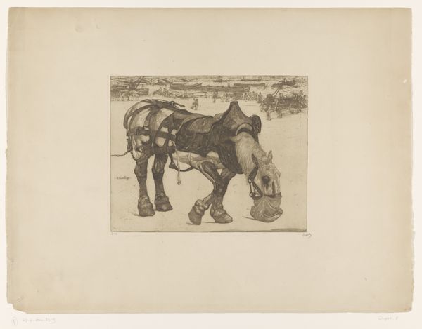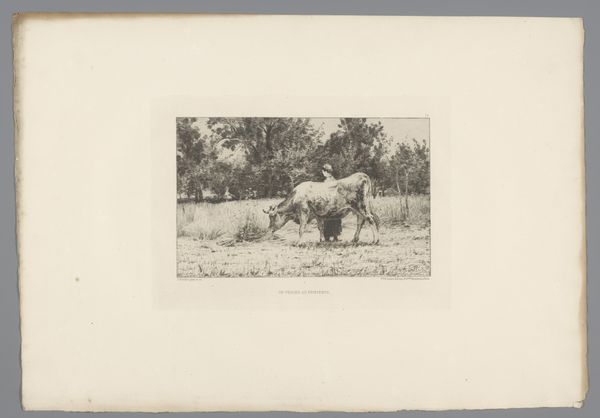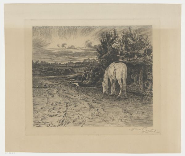 Curator: Alright, let’s dive in! Before us, we have “Landscape with Donkey”, dating back to 1878, created by the skilled hand of Léon Barillot, primarily working with etching techniques on prints. Editor: First impressions? Well, it’s wonderfully still. It’s got this very hushed quality, almost sepia-toned in feeling despite clearly being black and white. I sense a patient waiting, a silent communion between beast and nature. Curator: Yes, there's a remarkable serenity, isn't there? Barillot has used realism to anchor us, yet imbues it with something deeply personal. Focus on the lines, the density he creates—especially around the donkey. It really brings him to the forefront. Editor: Absolutely. I see how Barillot uses the density of the etched lines to create visual texture, which gives a striking tactile quality to the donkey’s coat, the rough bark of the tree... How would you contextualize this within the late 19th-century art world? Curator: Etching became an ideal medium for artists wishing to reproduce original work or for a democratizing way to offer their artistry for broader consumption. Note how it fits into a rise of interest in pastoral subjects, echoing a nostalgia for the disappearing countryside. Editor: The realism of the subject clashes somewhat ironically with a style—the etching itself—that draws attention to the artificiality of the work. There is this visual separation—subject of the common, but an intricate uncommon execution. Curator: It brings up something essential—the constant negotiation between representation and its artistic rendering. What do you feel is most resonant as you step away? Editor: For me, it's the quiet resilience. It’s a glimpse into the past rendered in the present and an experience of watching something so old remain, like it remains something permanently young in our shared understanding of art. How about you? Curator: I’m moved by the subtlety of his composition and this delicate moment when we confront our relationship with nature and those fellow beings who share it with us. And, you know, donkeys get such a bad rap sometimes! But here, the donkey is like, utterly content. Maybe even a little sly?