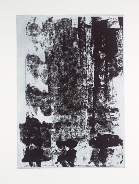 Curator: This is Peter Doig's "Concrete Cabin," held here at the Tate. It’s an aquatint etching. Editor: It's so dense! The interplay of black and white creates this claustrophobic, almost unsettling feeling. Curator: The print uses layering, which helps to abstract the architectural form. Its scale encourages an intimate viewing experience. Doig's cabin acts as a modern intervention within its natural setting. Editor: Certainly. The printmaking medium itself lends to the piece's historical weight, referencing techniques used for centuries to disseminate images and influence public opinion. Curator: Precisely. The high contrast pushes the boundaries of legibility, compelling the viewer to actively engage with the composition to decode it. Editor: It’s a great reminder of how artists can make us reconsider familiar structures and their places within a shifting landscape. Curator: Indeed. Doig provides us with a compelling examination of form and perception.