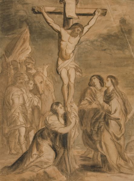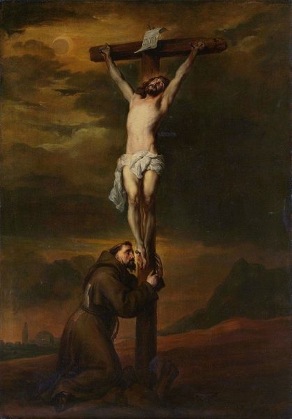Editor: Here we have a powerful oil painting by Anthony van Dyck entitled *The Crucified Christ Adored by Saints Dominic and Catherine of Siena*. It's dominated by this very Baroque sense of drama, figures caught in a swirl of devotion, a whirlwind of emotion, really. What's your reading of this painting? Curator: It is, isn't it, theatrical! Van Dyck understands drama like a poet understands the human heart. I see a raw, aching depiction of faith amidst profound suffering. Look how Christ is illuminated, while shadows cling to the saints below. Editor: So, is it this contrast you think Van Dyck is exploring: light versus shadow as hope versus despair? Curator: Partly that, absolutely! But consider the intimate connection Van Dyck creates between the earthly and divine. Angels float ethereally while the Saints cling to the foot of the cross, a visceral depiction of mortal struggle in proximity to Christ. See how Dominic gazes upward, imploring, almost yelling! Van Dyck brings a human reality to this otherwise divine depiction. The skull at the base–memento mori, as the Romans had it–quietly whispers in our ear "You’re next..." I wonder if the piece also serves as a commentary on Van Dyck's own mortality, too. He certainly loved layering meaning. What do *you* see when you let your gaze swim across the surface? Editor: I like what you say about it possibly being about Van Dyck’s own mortality. The skull and angels sort of point towards a kind of beyond… something else is coming, be ready for the sequel… Curator: Exactly. Van Dyck plays with a unique personal and collective idea about faith that can teach us so much about ourselves and others if we remain open. It makes my soul swim and float. Editor: Mine, too. It is as if art and history were telling the same story but in two separate languages. Curator: And that's what makes looking at art so very yummy!