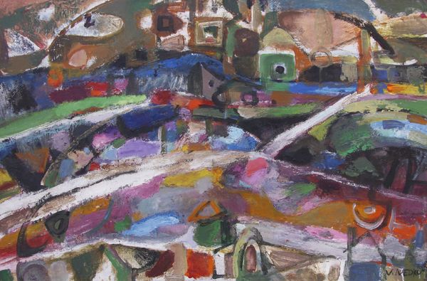 Here we see Roland Petersen's vibrant scene, 'The Hot Tub', realized through a tapestry of oil paint. The thick impasto and bold color blocks create a lively, tactile surface. The image offers us the impression of figures enjoying leisure within a stylized landscape. The composition divides into distinct zones of color. Petersen's application of semiotic systems of signs challenges traditional representation. What appears as figures and landscape resolves into planes of blues, greens, and yellows. This technique dismantles fixed meanings, pushing us to question the nature of perception and representation. The painting's structure is built upon a tension between abstraction and figuration. The forms, though suggestive, never fully solidify into recognizable shapes. This tension destabilizes established artistic values and encourages a more active, interpretive engagement from the viewer. This destabilization is not just aesthetic but serves as a larger cultural and philosophical discourse about how we understand and represent the world around us.