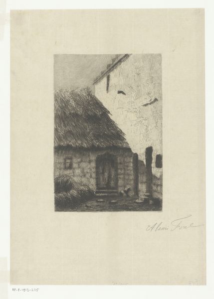 Curator: Here we have Jo Bezaan’s 1922 etching, “Rhenen.” What strikes you about it? Editor: Immediately, a stillness. The monochromatic palette coupled with the precision of the etched lines evoke a quiet reverence for this Dutch cityscape. I'm drawn to the tree that dominates the frame; it makes me think of a Japanese woodblock print somehow. Curator: Yes! The artist’s control over light and shadow gives a kind of solidity to what might otherwise feel very fleeting. The tree’s silhouette does command the foreground, acting almost like a theatrical curtain framing the tower beyond. It’s interesting how Bezaan simplifies the architecture and flattens the perspective, pushing towards abstraction but still maintaining a sense of place. I wonder, why Rhenen? What meaning did this place hold? Editor: Rhenen, a small town, was historically significant. Heavily fortified in the past, but also strategically vulnerable because of its position on the Rhine. During the Interwar period when Bezaan created this, anxieties around borders and national identity were certainly acute in Europe. Choosing such a charged, if seemingly picturesque, site feels... poignant, if perhaps not intentional. What's visible is a very traditional Dutch landscape; but perhaps we are to remember all that lurks behind it? Curator: It makes me wonder, then, if this wasn't just an aesthetic rendering of Rhenen, but maybe also a psychological one—a probing of the spirit of a place shaped by historical tension. There’s also a graphic quality to the work; look how the stark geometric shapes of the buildings contrast with the organic forms of the trees! This echoes similar visual experiments among the members of De Stijl around the same time, even if the end results are very different.. Editor: Exactly! I can see that tension between form and representation, between the concrete and the ephemeral, mirroring the anxieties of a time wrestling with its past and its future. I’d even say this image captures a uniquely Dutch ethos. Rooted in its soil, solid like its buildings—but always, subtly threatened. Curator: A fittingly understated sentiment, given the nature of the artwork itself, then! I will be thinking about all the past layers that still sit beneath the surface of this image. Editor: Precisely. I’m grateful this image reminds me to look harder, past surface appearances, to see what histories are embedded there.