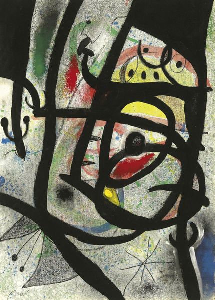Curator: Salvador Dalí's 1966 watercolor, "Femme voilée avec un turban bleu et lampe allumée," immediately evokes a sense of mystery. What’s your initial reaction? Editor: A veiled figure, shrouded in…chlorophyll? It's this intriguing combination of opulence—a jeweled turban, the magic lamp—and earthy, almost decaying, greens that strikes me. The materials and colors give it a strange textural ambiguity, is it shimmering silk or wet vegetation? Curator: Dali often juxtaposed disparate elements to create dreamlike scenes. Consider how "orientalism," a very specific style in art history, intersects with his well-known surrealist tendencies here. There's a Western gaze filtered through his own distinct lens. Editor: Absolutely. That blue turban reads like both a signifier of the "Orient" for a European audience, and a mass-produced cultural object easily consumed in his time. The veil obscures identity, commodifying an idea rather than portraying an individual. Is that metalwork adding relief? It's such a collage of visual and material tropes. Curator: The veil does much more than obscure. It invites speculation. We look through a keyhole into an imagined world, a carefully constructed persona. Dalí played with such archetypes throughout his career, inviting audiences to confront their own fantasies. Editor: Yes, but I find myself thinking about the making of the piece itself, the labor involved, the actual watercoloring... those thin washes over what looks like heavier metal details disrupt the smooth fantasy a bit. It's not a seamless dream, is it? It's obviously, materially, *made*. Curator: That's Dalí for you – both illusionist and provocateur. It questions what the social role of imagery really represents, don’t you think? Editor: Definitely food for thought. The tension between allure and construction certainly adds layers to its charm. Curator: Indeed, thank you for your perspective!