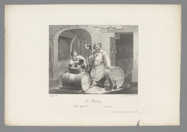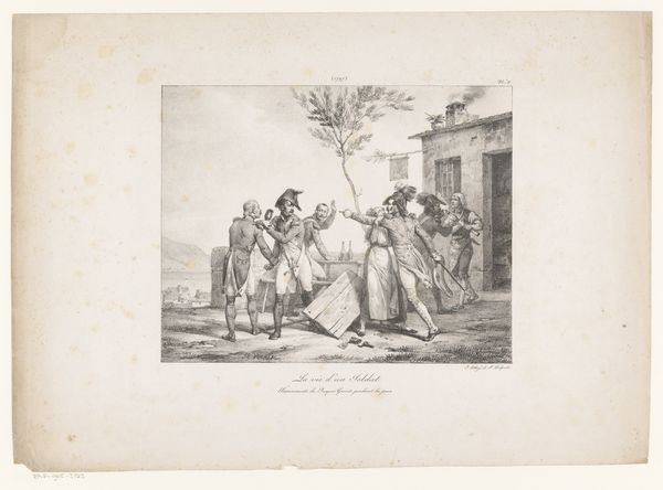 Curator: This is Auguste Raffet’s etching, "A Fortune Teller Giving a Consultation to a Man Using Cards," dating from about 1825 to 1829. The print on paper depicts a genre scene with detailed figuration. Editor: It’s a somber affair, isn’t it? The monochrome palette certainly sets a pensive tone, with such incredible detail in each etched line giving a sort of weight to the composition. Curator: Indeed. Raffet masterfully utilizes etching to create tonal variety. Notice the contrast between the stark white uniform of the man, perhaps a soldier given his attire, against the dense shading in the fortune teller's dress, indicating fabric and form. The printmaking process allowed for multiples, hinting at wider access. Editor: Yes, but look closer. Is this merely a charming genre scene, or does it offer social critique? The soldier's posture speaks of vulnerability as he hands over money, potentially highlighting the exploitation of vulnerable individuals during a time when many faced social inequality. There is certainly gender inequity visible as well in how both are depicted. Curator: I see your point. We need to consider Romanticism’s focus on the individual experience and the anxieties of the era, in tandem with printmaking’s evolution during industrialization. The fortune teller becomes both a source of hope and, potentially, exploitation, within this material framework. Editor: This consultation becomes symbolic of a larger power imbalance, I think. Who benefits from the soldier’s hope? Are the tools of divination being mobilized as a way to control individual aspirations within a structured societal system? We must ask whose interests this narrative serves. Curator: A keen interpretation. By considering these nuances – the material conditions of production, and social implications embedded in the image – we see the limitations of the supposed separation between 'high art' and what some may view as lower status imagery such as narrative etching, because here both comment upon and interact with cultural anxieties around class, social mobility, and expectation in that era. Editor: And, critically, reminding ourselves that even then, such divisions only existed for certain parties—divisions are never ‘neutral’ as it were, so it's crucial we see how race, gender and other identity intersections might shift perspectives when evaluating the narrative Raffet constructs through etching. Curator: A complex layering that challenges a singular reading, I think. Editor: Precisely; it shows the ever-lasting echoes from a very vibrant conversation—thank you for highlighting Raffet’s intriguing piece, its creation and context both inform our comprehension significantly.