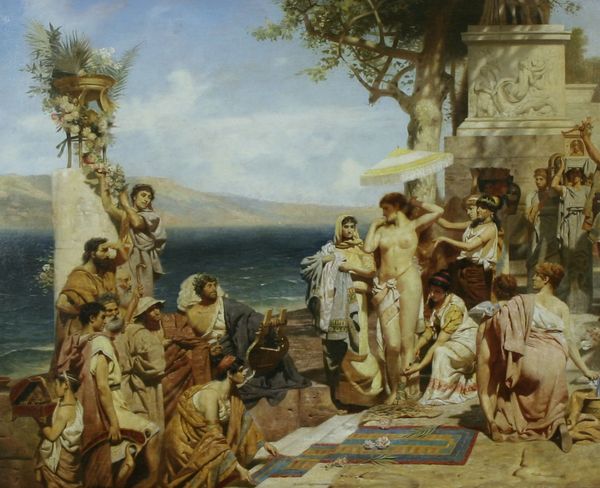 Editor: So this is "The Judgement of Paris" by Henryk Siemiradzki, painted in 1892. It's an oil painting depicting a scene from Greek mythology. It feels very staged, almost like a tableau vivant. What strikes you most about it? Curator: Immediately, I think about the complex legacy of Neoclassicism. Siemiradzki, though working in the late 19th century, is deeply entrenched in this tradition which consciously resurrected classical aesthetics. This revival, however, happened within a very specific social and political context, mostly among the dominant European and white elites. Do you think his vision of ancient Greece speaks to that, a kind of idealization linked to power? Editor: I think so, definitely. It feels romanticized. Were there alternative interpretations of Greek myths at the time? Curator: Absolutely. There were burgeoning artistic movements questioning these idealized visions. Realism and early Symbolism, for example, explored the darker, less palatable aspects of human existence, moving away from the grandiose narratives favored by academic art. How might viewing this painting through a feminist lens shift our understanding? Consider the objectification of the goddesses, and Paris's role as a male judge. Editor: I see your point. The goddesses are presented for male appraisal, which is kind of uncomfortable given the power dynamics implied. Does Siemiradzki engage at all with critiques of colonialism through his rendering of classicism? Curator: That's a compelling question, and one not often asked about Siemiradzki. The visual cues like architectural details suggest specific regions dominated by Empires throughout the 19th century. By replicating such environments, is he inadvertently legitimizing existing social hierarchies or expressing sympathy with people oppressed at that time? His intentions remain complex. Editor: It gives me a lot to think about—beyond just a pretty picture. I guess there’s more here to consider when looking at supposedly neutral historical painting, especially concerning power dynamics. Curator: Precisely. Art always reflects, either consciously or unconsciously, the society that produces it, inviting us to question whose perspectives are centered and whose are marginalized.