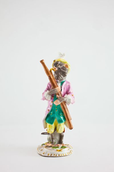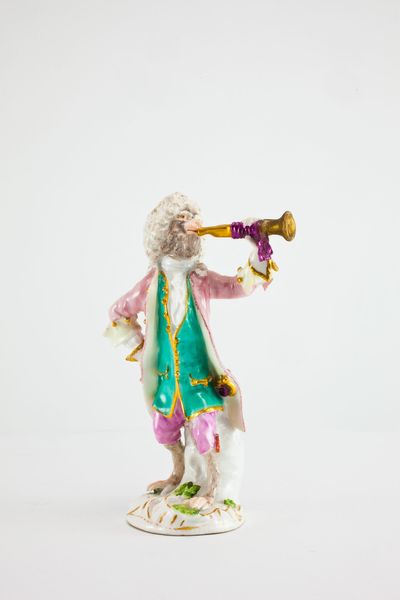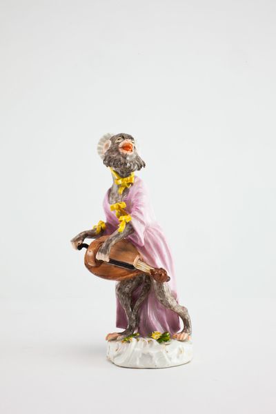 Curator: Alright, let's take a look at "Conductor for the Monkey Band," a porcelain sculpture crafted around 1765 by the Meissen Porcelain Manufactory. It resides here at the Art Institute of Chicago. Quite the piece, wouldn't you say? Editor: Utterly bananas! Sorry, I had to. It’s like a fever dream of powdered wigs and primate pandemonium. Is it angry, or just… really into conducting? Curator: It’s part of a larger series called the "Affenkapelle," or Monkey Orchestra, reflecting a popular trend of satirical depictions of courtly life. Think of it as a commentary on social hierarchy, filtered through simian mimicry. The monkey, a symbol of imitation, allowed artists to playfully critique human foibles. Editor: So, like a proto-meme? Only instead of ironic dog photos, it's powdered-wig primates? I can dig it. The attention to detail is wild, though. Look at the frills on that jacket! It’s more elaborate than anything I own. Curator: Absolutely! And the use of porcelain allows for an incredible level of detail, capturing not just the textures of the clothing but the expressive quality of the monkey's features. It echoes back to the time when porcelain itself represented high-class status. It’s delicate, ornamental, and pointedly artificial. Editor: Which amplifies the satire, right? The artificiality of the form matches the artificiality of the social rituals being lampooned. Also, let’s not ignore the open mouth— it is screaming, singing, maybe both! Curator: A fitting detail! It seems to be directing, wielding his baton and orchestral score! The mouth suggests an eagerness, a wild energy, perhaps even the chaos that underlay the superficial order of 18th-century society. Editor: I like the touch of subtle humour—how it presents cultural echoes of the time. Now I am picturing him leading a symphony of screeching violins and out-of-tune flutes. A beautiful, if slightly unhinged, little sculpture. Curator: Indeed. It's a reminder that beneath the surface of refinement, there's always a bit of delightful madness. Editor: It seems to tell the tale about how the monkeys in powdered wigs reminds us that no matter how sophisticated we try to be, there's always a little bit of primate within us all. Thank you for the tour.