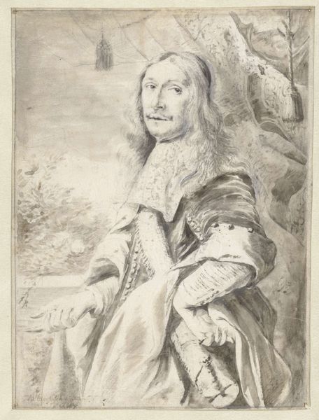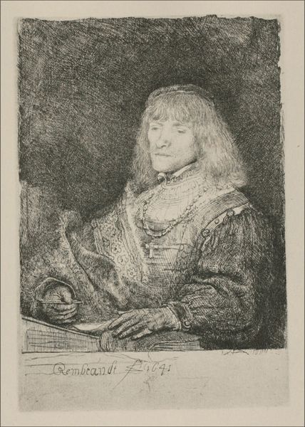 Curator: Here we have a print called "Mansportret," or "Portrait of a Man," dating from between 1761 and 1784. The artist, Johannes Janson, has created this piece using engraving techniques. Editor: Ooh, he looks… melancholy. Kind of lost in thought, right? And everything's in this muted grey; it gives the piece this overall dreamy, contemplative feeling. Like a half-remembered melody. Curator: It’s fascinating to consider the social context in which this portrait was created. During the late 18th century, portraiture served as a tool for solidifying social status and constructing identity. We must also consider the construction of gender roles during this period. This portrait, however, avoids the common signifiers of wealth. Editor: Yeah, I was going to say, he doesn't strike me as super wealthy, despite the frilly shirt and jacket. It's more… introspective. Almost vulnerable, y'know? I wonder what he was thinking about while posing. Or, even better, what Janson was thinking while making it. Did he even *like* this dude? Curator: I agree that it invites curiosity about his psychological state. Janson’s artistic choices also subtly disrupt established norms; it’s the direct gaze that engages the viewer. We can infer perhaps a critique of societal expectations or a subtle exploration of the inner life beyond the surface. The ambiguity of the setting also emphasizes that this isn’t about external validation. Editor: True, the background *is* a bit murky. It focuses our attention right on him. And those eyes! They really draw you in, don’t they? It's funny how a simple engraving can capture so much... It's like he's trying to tell you something, a secret maybe. Like a quiet poem waiting to be read. Curator: Absolutely, the way Janson used light and shadow—through the print medium, creates this remarkable emotional depth. This engraving offers us insight into a moment of quiet contemplation, reminding us that portraiture extends beyond a mere representation of physical appearance. Editor: It's more of a vibe, really. A historical vibe, sure, but one that resonates with anyone who’s ever felt a little lost, a little pensive. A beautifully rendered mood. I'm glad to have stumbled upon this quiet little world that Janson made.