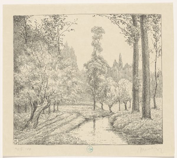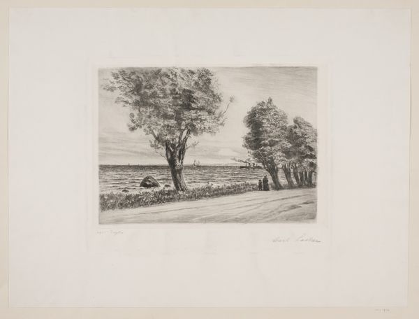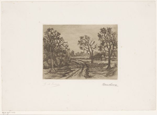 Joseph Edouard Van Looy made this etching, "Laan tussen velden," using a monochrome palette, a symphony in subtle grays. The magic lies in the marks themselves, each one a whisper of intention, building up to the whole scene. I love how Van Looy teases out texture. See how the trees lining the lane are rendered with these tiny, nervous lines, almost like he’s sketching the air itself. It's not about perfection or photographic accuracy, but about feeling the weight and presence of these natural forms. The path has a smoother appearance, achieved through more solid areas of tone. I think of Agnes Martin, who used pale colors and lines to evoke feelings of serenity. The light at the end of the lane feels like a beacon. Van Looy invites us to wander, to lose ourselves in the quiet beauty of the countryside. It is this quality that makes this piece so evocative.