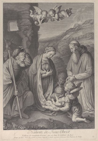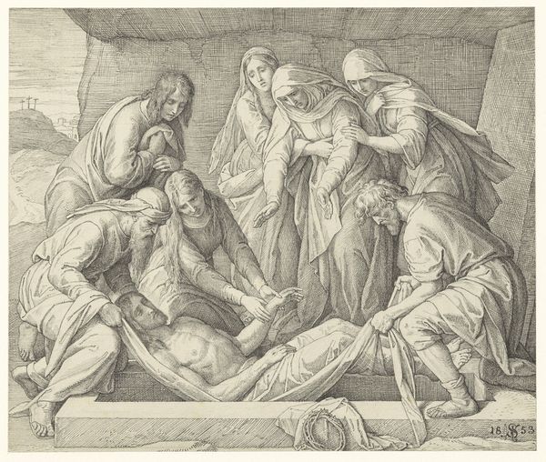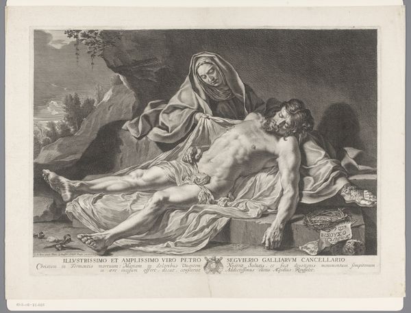 Etienne Baudet created this engraving, "Bewening van Christus," sometime between his birth in 1638 and death in 1711. The scene depicts the lamentation of Christ, a common subject in religious art, representing the moment when Jesus's followers mourn his death after the crucifixion. Made in France, this artwork reflects the strong influence of the Catholic Church on artistic production during that period. Religious institutions often commissioned or supported artists. Baudet's engraving, with its detailed lines and dramatic composition, likely aimed to evoke strong emotions and reinforce religious beliefs among viewers. Notice that the figures are idealized, which speaks to the prevailing artistic conventions of the time. Understanding the historical context and the artist's background helps us appreciate how social and institutional forces shaped this artwork's creation and its intended meaning. Art historians delve into archives, letters, and other primary sources to uncover the intricate web of influences that shaped artistic creation in different eras.