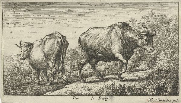 Albert Flamen created this etching, "Bokken", using delicate lines to depict a pastoral scene. The composition arranges three goats within a sparsely detailed landscape, evoking a sense of tranquility. The use of etching allows for precise rendering of textures, seen particularly in the animals' fur and the foliage. The etcher's marks create tonal variations that define the forms and add depth to the composition. Note how the texture of the goats are described with dense clusters of lines, giving them weight and presence. This meticulous technique invites the viewer to consider the formal qualities of the work—the balance of light and shadow, and the rhythmic repetition of lines. The strategic placement of the goats creates a balance, while the subtle background details add depth without distracting from the main subjects. The artwork demonstrates the way that form and structure can be as significant as subject matter in conveying meaning. This etching invites us to appreciate the technical skill and aesthetic choices which make it an enduring work of art.