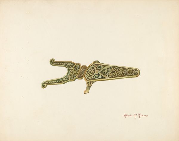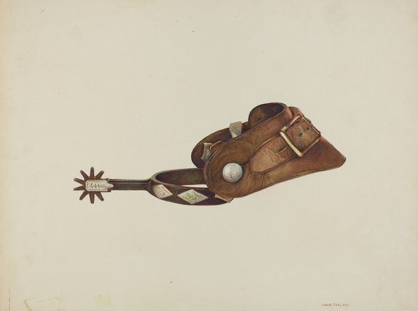 Editor: Here we have William Kieckhofel's "Spur," a watercolor and ink drawing on paper from around 1939. It depicts a cowboy spur; the drawing style feels almost like an advertisement or technical illustration. How do you interpret this work? Curator: What strikes me is the focus on a single object associated with the romanticized, and often problematic, history of the American West. Consider the role of the cowboy – often depicted as a symbol of freedom and rugged individualism. But whose freedom are we talking about? This spur, and what it represents, must be contextualized within a larger narrative of westward expansion, dispossession, and violence against Indigenous peoples. How does focusing on this specific object alter or reinforce that narrative, do you think? Editor: I guess I hadn't really thought of the implications beyond the Wild West aesthetic. So you're saying the spur isn’t just a spur. It’s symbolic? Curator: Precisely. The spur becomes a tool, a device related to both animal labor and violence and male authority and privilege. Reflect also on its date – around 1939. The US was facing critical issues of socioeconomic disparity after the Depression, while the march toward another World War loomed. This object stands almost as a relic, or perhaps a diversion from urgent and broader crises of race, class, and identity. It romanticizes a mythologized past that actively erases certain perspectives. What is its impact, in your view, when displayed in a contemporary museum setting? Editor: It provides a contrasting perspective… a visual marker for conversations about forgotten and misrepresented histories. I initially saw only a neat watercolor, but now I see it as something prompting a critical discussion. Curator: Exactly! It’s about peeling back those layers of representation and questioning whose stories are being told, and whose are being silenced.