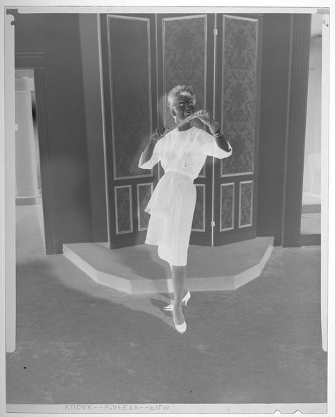 Editor: Here we have an untitled fashion portrait by Martin Schweig. What strikes me is the almost dreamlike quality of the image, and the woman's theatrical pose. What do you see in this piece? Curator: It's a dance between light and shadow, isn't it? This image, like a half-remembered dream, makes me think about constructed identity, the artifice of fashion. The staging feels deliberate, almost like a play. I wonder what narrative Schweig was trying to create. Do you feel a sense of detachment from the subject? Editor: I do, actually. It's as if she's a character in a story we don't quite know. Curator: Precisely! It leaves room for our imaginations to wander, piecing together fragments of a story, a mood, a bygone era. I like that. Editor: Me too. I'll definitely look at fashion photography differently now.