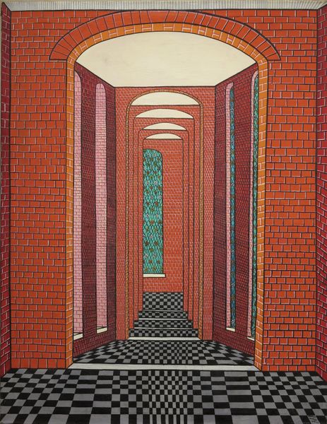 Curator: Eric Ravilious’s watercolour, "The Greenhouse: Cyclamen and Tomatoes," part of the Tate collection, presents a view into a controlled, cultivated space. Editor: My first impression is of coolness and repetition. The pale palette and linear composition create a sense of serene order. Curator: That order speaks to the social fascination with nature and domesticity in the interwar period. Greenhouses became symbols of controlled abundance, reflecting middle-class aspirations. Editor: Absolutely. The artist's mastery of line and wash gives a delicate transparency to the greenhouse structure, contrasting with the solid forms of the potted cyclamen. Curator: Note how the grid of the greenhouse architecture mirrors the organized rows of plants, underscoring a desire to systematize and contain nature. Editor: It’s a compelling tension. The formal elements perfectly capture both the beauty and the artificiality of the scene. Curator: Considering Ravilious's later war art, this earlier work also reveals a fascination with constructed spaces and controlled environments. Editor: Yes, and it really makes one consider how such spaces reflect our complex relationship with the natural world.