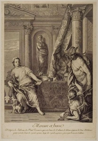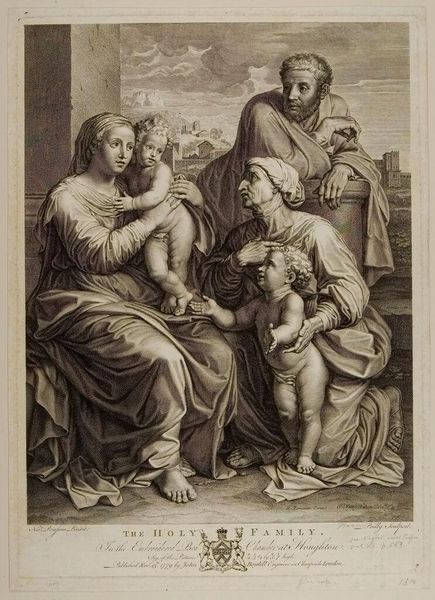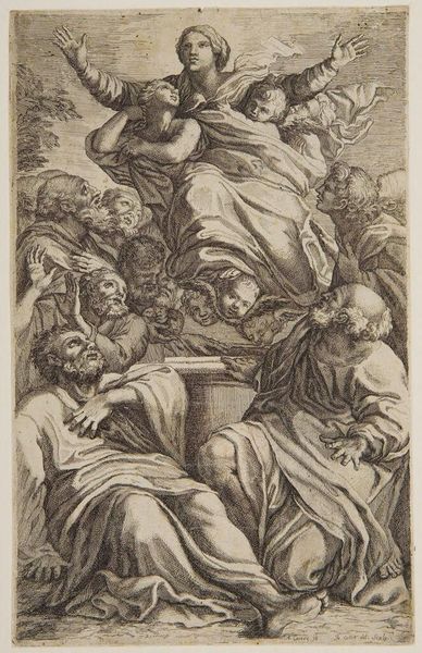 Curator: Let’s discuss this intriguing print, “Madonna Enthroned, with the Infant Saint John, Saint Francis, Saint Jerome, and Saint Catherine,” by Joseph Wagner, who lived from 1706 to 1780. It's quite a gathering of saints around the Virgin! Editor: My initial impression is one of hushed reverence, like a dream fading at the edges. The etching feels so delicate and ethereal. Curator: The composition reflects Baroque sensibilities, particularly its use of dramatic diagonals and a focus on religious ecstasy, designed for the devotional practices in the 18th century. Editor: You know, looking at it, it feels like something is being revealed, a secret whispered through the ages. The expressions are so intense. Curator: These prints played a vital role in disseminating religious imagery, making it more accessible to a wider audience. Editor: True, it's almost like a printed sermon, though I am much more drawn to its subtle emotional register and its appeal to something beyond literal belief. Curator: Its distribution tells us much about the dynamics of religious and political power at the time. Editor: Precisely. It's amazing how a static image can ignite so many interpretations. Curator: It gives us insight into the societal values that formed the artistic discourse of its time. Editor: Indeed, an echo of history, resonating with the present.