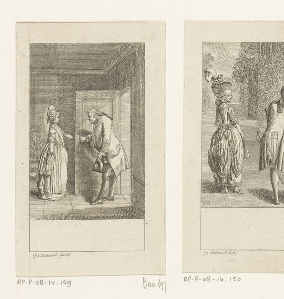 This delicate engraving, "Complimenteuze dwaasheid", was made by Daniel Chodowiecki. Note the exaggerated bow, a gesture laden with social meaning. In the 18th century, such bows were not mere greetings; they were performances of status, echoing the rigid hierarchies of the court. Observe how this motif of exaggerated deference appears across cultures. Think of ancient Egyptian depictions of subjects bowing before the Pharaoh, or medieval illustrations of knights kneeling before their lords. Each bow, though seemingly similar, carries the weight of its own time and place. Consider the psychological dimension: the act of bowing can be seen as a symbolic submission. It represents a complex interplay of power, respect, and perhaps even hidden desires. This dance of gestures has recurred throughout history, evolving in form but remaining constant in its underlying expression of human relationships, a perpetual return.