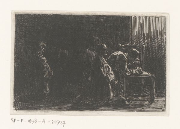 Editor: This is Gerald Pryse’s "Untitled (Refugees Sheltering among Ruins)." It's a poignant image, full of shadow. What symbolic weight do you think these figures carry? Curator: The darkness itself is a potent symbol here. It suggests not only the physical deprivation but also the psychological trauma of displacement. Do you notice how the bars of the gate both separate and frame the figures? Editor: Yes, there’s a sense of being trapped but also observed. Is that significant? Curator: Absolutely. The gate is a barrier, but it's also a symbol of institutional failure – the inability of society to protect its own. The draped figure...almost iconic, like a sorrowful Madonna? Editor: I hadn't considered the religious element, but I see what you mean. It certainly adds another layer of meaning to their suffering. Curator: Indeed. Each figure, shrouded in shadow, becomes a vessel for collective grief, echoing countless stories of loss and resilience. Editor: Thank you, I now appreciate the depth of symbolism layered within the image. Curator: And I, the power of the image to evoke such empathy across time.