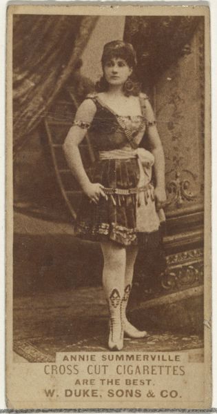 Editor: This is "Annie Summerville, Corsair Co." from the Actors and Actresses series made between 1885 and 1891, produced by Allen & Ginter for Virginia Brights Cigarettes. It seems to be a photograph that’s also been printed or drawn on. The sepia tone and the actress’s somewhat theatrical pose give it an antiquated and stylized feel. What strikes you most about this image? Curator: It’s primarily the structural contrasts. Notice how the rigid verticality of her headdress opposes the curve of her sword, which bisects the composition? The background, seemingly a rudimentary backdrop, introduces additional visual layers, though these elements remain subordinate. How do you read the symmetry at play here? Editor: I see what you mean about the headdress and sword! It's like the sharp, confident lines of the headdress against the flowing shape of the blade. The symmetrical nature of her body's central composition is reinforced by those mirroring patterns. Are the other shapes or lines relevant? Curator: The visual rhythm established through repetitive ornamental details on the costume serves a purpose beyond mere adornment. Focus instead on how this piece operates primarily through tonal modulations rather than chromatic complexity, wouldn't you agree? The lack of vibrant colors allows us to concentrate on the textural variety. Editor: Yes, the textures! I notice how the softness of the background blends seamlessly with the figure, with her elaborate outfit adding the bulk of the fine detail. This contrast with its hard edges and adornments directs our eye back toward the performer's central presence. Curator: Precisely. It is not necessarily about representation but about the internal relationships within the pictorial space. Hopefully you now see it less as an artifact, but instead appreciate its orchestration of form, tone, and texture. Editor: Definitely. Focusing on the structure, balance, and textural variations has helped me look beyond the literal depiction and see its artistry. Thanks for illuminating those elements for me!