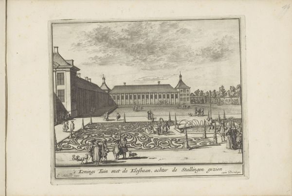 Curator: Look at the detail in this print; you can see "View of Huis ter Nieuburch in Rijswijk" created by Jan van Vianen in 1697. Editor: It has such a regimented formality, doesn't it? A monumental building taking center stage and full of figures, it immediately conveys power and a bit of an ominous mood to me. Curator: Indeed. Jan van Vianen made it as an engraving, it represents much more than just architecture, think of Dutch Golden Age values with colonial intersection of power; also this country estate in Rijswijk where the Treaty of Rijswijk was signed, marking a turning point in European political power structures. The formal gardens would be further reinforcement of that power on display, a demonstration of mastery of both people and land. Editor: That makes sense given the subject. It looks very costly to build something of this scale and level of grandeur, so yes the political history must certainly be highlighted given how social dynamics played out during this time period as well and to what end for these colonizers to enjoy such leisurely lifestyles. Can we also talk about the material qualities that engraving offers? Curator: Most certainly! How the technique lends itself to these political assertions is certainly part of the dialogue as well. Engraving like this was skilled manual labor. I understand your impulse to investigate the labor behind creating something so impressive in this view, too. The detailed work celebrates material creation during the Baroque. Editor: Absolutely! Each precise line, each calculated mark serves a purpose. Thinking about this painstaking process enriches the historical context. These details show how materials and labor are tied to the overall impression of political stability and societal power, it really brings into view the social underpinnings for displays of such magnitude to viewers in their context. Curator: I agree! Exploring this print, from its materials and its relationship with political identity and race in a moment in Dutch history helps me connect the work's production with the broader issues in a deeper, intersectional way. Editor: Me too. Considering materiality gives insight into society and even helps reveal undercurrents, shifting relationships of consumption, production, and what such luxury entailed at this pivotal turning point in sociopolitical history.