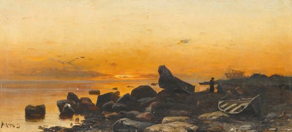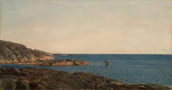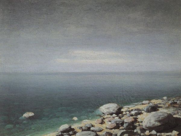 Editor: This is Amaldus Nielsen's "Godvær, Jæren," painted in 1894, using oil on what looks like a relatively small canvas. There's such a somber, contemplative mood to it. It really captures a sense of isolation. What can you tell me about it? Curator: Immediately, I’m drawn to the materiality of the paint itself. Notice the visible brushstrokes, especially in the sky. It points to Nielsen's active labor and the sheer physical effort involved in creating this atmospheric effect, one stroke at a time. Also, it looks like he’s painted this "en plein air". That has implications, right? Editor: Yes, I think so! That Impressionist emphasis on capturing a fleeting moment means a different way of interacting with the environment itself. How does that method affect the final product? Curator: Precisely! The portability of his materials -- the canvas, oils, and easel -- enabled him to directly confront and represent the rapidly changing conditions of the Jæren coastline. It also implies that he had access to specific resources to purchase all that he needed for making this painting! Editor: So, instead of just a romanticized view of nature, we're also seeing the social and economic circumstances that allowed this piece to be created. Curator: Exactly. How does Nielsen's choice of subject, the coastline itself, play into that social context? Think about what the coastline would have meant for the local communities there in 1894. Editor: Fishing, trade, maybe even a burgeoning tourist industry... Painting a coastline isn't just a neutral act; it's choosing to depict a space that has a specific role within society. I never considered that when observing this piece! Thank you. Curator: My pleasure. Recognizing the significance of these everyday sites gives this piece depth. I am thinking of those artist cooperatives back in the late 1800's that sought out common folks, not patrons.