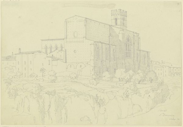 Editor: Here we have Friedrich Maximilian Hessemer's "S. Madonna della Catena in Palermo," possibly from 1829. It's a delicate architectural sketch, almost ethereal in its lightness. The aged paper and faint lines create such a nostalgic mood. What whispers to you when you look at this? Curator: Oh, whispers indeed! I imagine Hessemer, perhaps a little travel-worn, perched on a wobbly stool, his charcoal dancing across the page, trying to capture not just the facade of the church, but the very essence of Sicilian light. Notice how he renders the ornate details with such precise strokes, juxtaposed against these very loose suggestions of the surrounding landscape. Editor: It feels more like a memory than a precise record. Is it typical for architectural drawings to be so…painterly? Curator: Well, that's the delicious contradiction, isn't it? He's not just documenting; he's interpreting. He's letting his artistic soul wander through the arches and cornices. Imagine him soaking in the echoes of history as he sketches, the dust of centuries clinging to the stone, imbuing the paper with a life of its own. Do you catch the hint of wistfulness in his lines? Editor: Absolutely! It makes me want to grab my sketchbook and head straight to Palermo. I can almost feel the Sicilian sun on my skin just looking at this. Thanks! Curator: My pleasure! It reminds us that even technical drawings can be intensely personal, infused with the artist’s unique vision and emotion. Never underestimate the soul of the sketch!