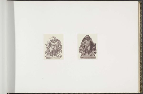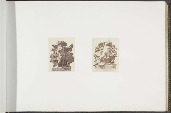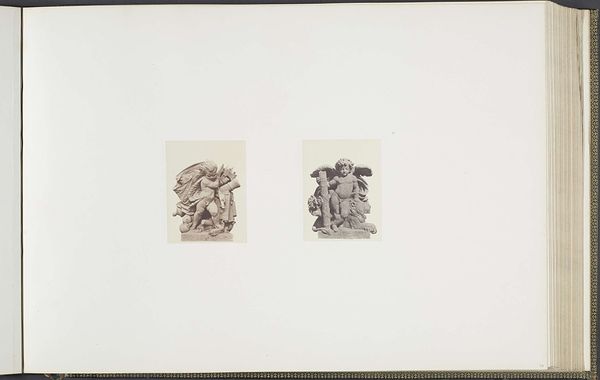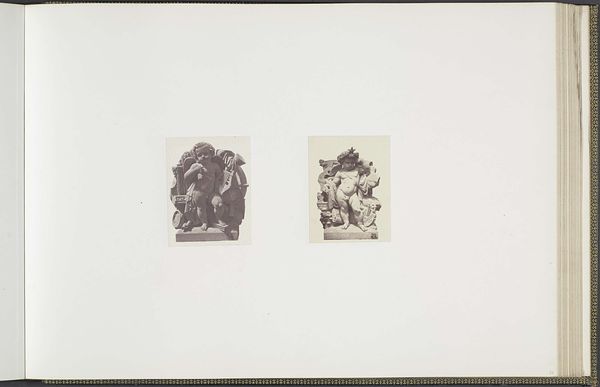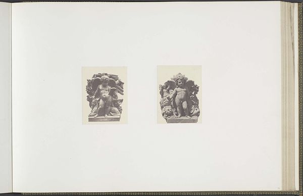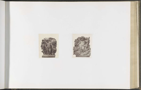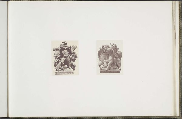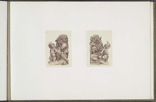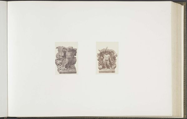 Curator: Well, aren’t these intriguing! We're looking at a photograph from between 1855 and 1857 by Edouard Baldus, titled "Gipsmodellen voor beeldhouwwerken op het Palais du Louvre." It depicts plaster models for sculptures: "Les Découvertes maritimes" and "La Mer." What’s your first impression? Editor: Claustrophobia, surprisingly! Even in monochrome and miniaturized, these cherubic figures practically burst from their shallow depths, crammed with symbolic nautical flotsam. The weight of history bearing down, perhaps? Curator: Exactly! Both cherubs serve as allegories, linking maritime discoveries and the sea itself with cherubic innocence. Baldus captures them frontally and emphasizes their mass and density. It feels intentionally imposing despite its humble size. The photograph serves to document the planned sculptures. Editor: And isn’t the cherub on the left entangled in tools of navigation—an astrolabe, books? He seems almost overburdened by knowledge. Then, on the right, the cherub merges with a turbulent, baroque wave...it feels quite symbolic about confronting nature, both gentle and overpowering at the same time. I sense some psychological ambivalence there. Curator: Good eye! That cherub's pose and the drapery swirling around him echo classical depictions of the sea god Poseidon or Neptune. And the other one…there’s that faint smile playing on his lips while he’s buried beneath maps, boxes, tools…. it speaks to how exploration can lead one astray just as easily. I wonder if that captures the imperial spirit—expansion in thought or greed? Editor: Perhaps both. I think that academic art tried to hide its ideological investments, which Baldus' photo inadvertently exposes. The rigid compositions betray a desire to make history as much as simply depicting its future. These images project authority; not observation, control—which tells us a lot about how power expresses itself in cultural memory. Curator: Interesting perspective. Thinking about what we learned about that composition helps see things anew. Editor: Me too! These tiny cherubs have got me pondering giant ideas now. I guess, sometimes the greatest journey comes from the smallest details.