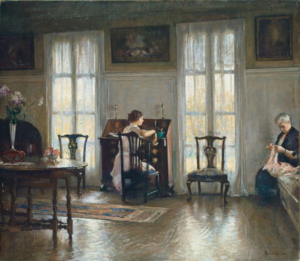 Curator: The work before us is entitled "Interior" painted in 1917 by Konstantin Gorbatov, a Russian artist working around the time of the Russian Avant-Garde. He chose oil paints to craft it. Editor: Oh my. I am immediately struck by its intimacy, despite being, well, an "interior." It feels incredibly personal. The jewel tones, the patterns, the crowded placement of furniture… It's almost theatrical, like a stage set waiting for the players to enter. Curator: I see what you mean by theatrical. Note the prevalence of reflections here – in the mirror, on the polished surfaces. Mirrors symbolize introspection but, in drama, mirrors can be used for reveals or surprises… perhaps a narrative hint? Editor: The portraits clustered on the wall amplify that narrative pull. We are in someone's inner sanctum here and they are, very deliberately, sharing it with us. Even the flowers, their colours, strike me as consciously chosen, not just casually arranged. They become signifiers of affection and love, like stage props. Curator: Right. We understand why paintings of rooms like these became so significant within Symbolist and even pre-Surrealist art. The placement of items or people acts almost as clues towards inner feelings of the occupant or artist, much like you suggest, as characters in a story. Gorbatov may have simply desired to recreate a pleasant bourgeois interior. But the arrangement… yes, you’re on to something. Look closely, one notices things, then finds more within. It creates a feeling – more than is explicitly shown, but deeply understood. Editor: Ultimately, it is the layering that speaks. Each surface vying for your attention. The room becomes a puzzle that might yield all kinds of symbolic treasure if given enough attention. I feel both comforted and claustrophobic viewing this image. Gorbatov really managed to put an essence on canvas, far beyond representation of an Interior. Curator: It certainly has layers, in every sense. An open invitation, I think, to bring one’s own reading to its contents, it creates its very own, small personal story in each viewer's mind. Thank you for bringing those treasures out.