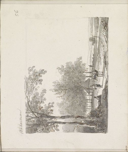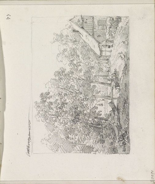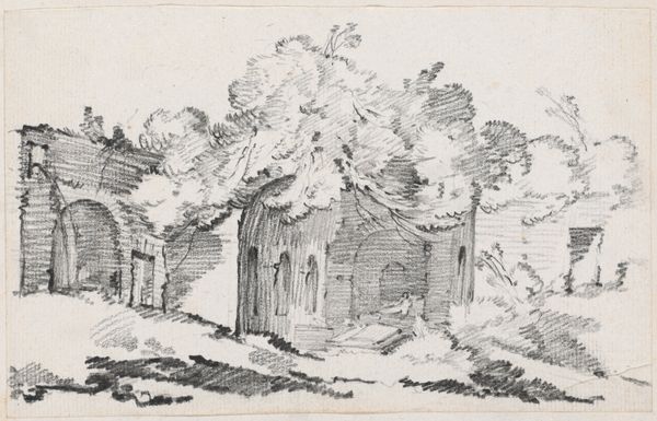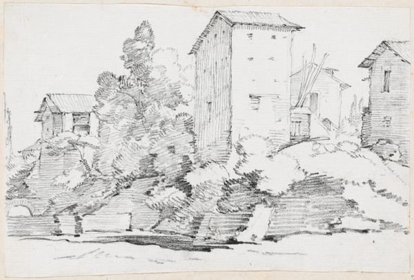 Curator: Looking at this image, I'm instantly transported. It's got a kind of melancholic stillness. Like pausing during a walk, knowing something's shifting inside. Editor: Indeed. What we see here is "Houses beside a Road in Italy," a pen and ink drawing made by Joseph Marie Vien, sometime between 1744 and 1750. It’s rendered with swift, confident strokes. The tonality leans on the gray side, offering a visual weight that grounds the scene. Curator: You know, what grabs me most isn’t the precision, but how imperfect it all seems. It’s a fleeting sketch, really. Like a visual note he jotted down. It captures that liminal space, that almost-memory we all carry around. The tilted rooftop almost echoes the slant of our minds trying to hold onto a thing. Editor: The composition’s certainly key. Vien’s structured this with careful attention to negative space— the untouched portions of the paper balance the density of his ink work. Look how the sharp angular lines define the buildings in stark contrast with the softer foliage around them. There's a duality there, a dance between the man-made and nature, don't you think? Curator: Absolutely, it’s like a conversation. The house, stable and solid—a presence—and that gnarled tree with its twisting limbs... it is trying to reach out but stuck right there by the roadside. And there is also someone in there, look the tree! Its roots may reflect this artist's own roots somehow… yearning. Editor: Quite a Romantic reading! I find that Vien is less concerned with imbuing the scene with profound sentiment than creating formal contrasts. Notice, too, how the textured ground serves as an anchor. Without it, the whole drawing would feel floaty, unbound. The shadows offer both depth and weight to the whole composition. Curator: Yes, and without this anchor you may fail to see the beautiful story being captured; all about subtle emotions and shifting senses of perception! It's really like gazing into the depths of someone else's heart... Or perhaps, his travel sketchbook... A beautiful little melancholic scene. Editor: Right, it certainly captures an era of classical formal construction methods applied, with a focus on precision drawing techniques that makes this image incredibly appealing and delightful for us.