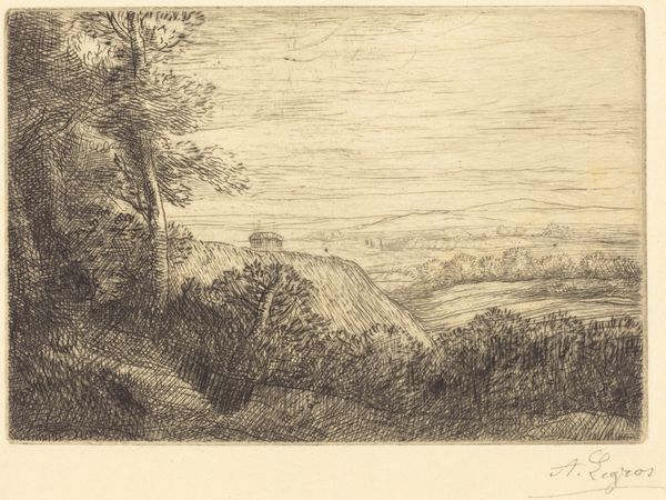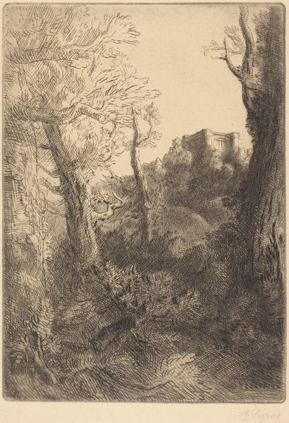Editor: This is Alphonse Legros' "Landscape: Near Chailleux", done with etching. It’s hard to pinpoint the exact date. The dense foliage and contrasting light create an almost mystical feeling. What's your interpretation of this landscape? Curator: As a materialist, I'm drawn to the etching process itself. The lines, the physical act of incising the plate, the labour. Think about the societal context: Was Legros critiquing or glorifying rural labor with his focus on the physical landscape? Editor: That’s interesting; I hadn’t considered the labor aspect. So, by looking at the medium, we can understand social commentary? Curator: Absolutely. Etching, a process involving acid, metal, and considerable skill, democratized printmaking. Was it making landscapes more accessible or contributing to the commodification of nature? The material bears witness. Notice the variations in line weight; how does that affect our perception of depth and texture, and, consequently, of the value placed on representing the land? Editor: The line weight really does give texture to the leaves and branches, makes it feel tangible. Curator: Exactly. Consider the consumption of landscapes in 19th century Europe. Were these images intended for an urban audience nostalgic for an idealized rural life? The mass production capabilities of etching would enable that consumption. Editor: I never thought about art quite that way – as being connected to labor and economics. Curator: Art is rarely created in a vacuum. Looking at materials and production methods gives us a potent lens through which to view not just the aesthetics, but the entire socio-economic landscape of the artwork. Editor: This definitely opens up new avenues of interpretation for me. Thank you!