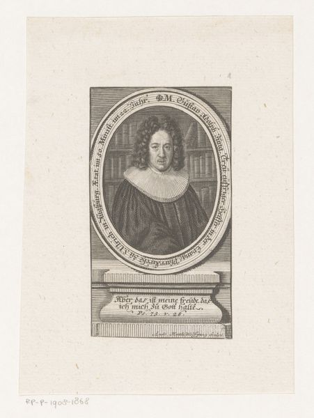 Editor: Here we have Gaetano Vascellini’s "Portrait of the Poet Ugolino di Vieri," an engraving on paper from around 1755 to 1805. It feels like a formal, almost austere depiction. What do you see in this piece? Curator: I see a carefully constructed representation steeped in the visual language of power and intellect, common among the literati of the period. But I also want to challenge this initial reading: What are the potential biases at play when representing someone like di Vieri, and who benefits from this portrayal? The portrait, framed within the conventions of its time, reinforces established hierarchies, suggesting that access to knowledge and artistic expression was certainly not democratized, don't you think? Editor: Definitely. The background of books feels like a conscious symbol of knowledge. Are there further meanings beyond just indicating his profession? Curator: Precisely! Consider how literacy and the creation of literature were linked to political power structures. Di Vieri's access to these resources underscores his elite status. So, perhaps it's interesting to note whose stories *aren’t* being told and how this portrait serves a purpose in validating particular social positions. Does understanding this context change your reading of the artwork at all? Editor: It does. I hadn’t considered the inherent social commentary. Curator: And thinking about the choice to depict di Vieri as a poet… Poetry during that time was often used to express dissent or to reinforce political ideals. Recognizing his place within the larger literary and political context opens the door to considering the role art plays in influencing broader sociopolitical discussions. Editor: I’m so glad you pointed out the layers of social meaning woven into this seemingly straightforward portrait. Curator: Indeed, looking closely reveals a whole network of cultural signals!
