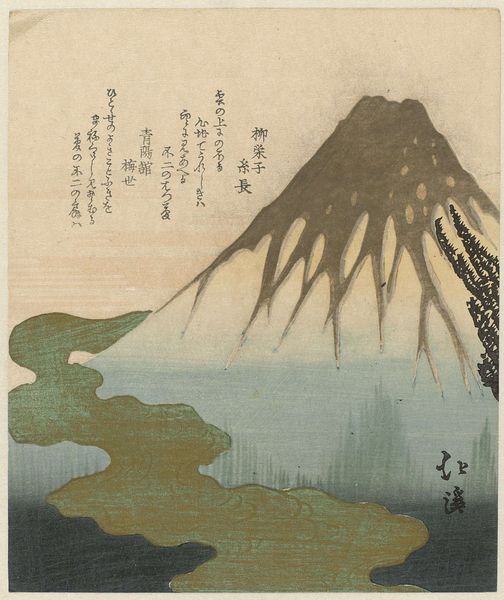 Curator: This work is titled "Setting Moon on Waves," created in the 19th century by Kubo Shunman. It's a woodblock print, very much within the ukiyo-e tradition. Currently, it resides here with us at The Met. Editor: Immediately, I am struck by the dynamic yet tranquil mood it conveys, paradoxically achieved through contrasting the jagged lines of the shoreline against the softly setting moon. What grabs you first? Curator: The way it captures the intersection of natural beauty with social commentary typical of ukiyo-e. It seems Shunman’s choices here create a unique viewing lens into the floating world through commentary about human relation to nature, especially in times of rapid societal transformation. Editor: Note the masterful use of line – observe the carefully incised marks that create the illusion of wave movement, balanced by the smooth gradation of color used for the moon, a testament to Shunman's technique, inviting philosophical exploration into the dualities of the world. Curator: And, how this composition subtly challenges social hierarchies. Think of the way traditionally dominant landscape art centered the powerful and elite. Here we find instead common access, focusing on the transient beauty experienced by anyone on a beach or a shoreline, democratizing beauty. Editor: Let's not forget the poetry inscribed on the work—a critical element. What interpretive layer does this text add when coupled with the visual elements, especially since the two work as a unit and a unified experience for the viewer. Curator: Precisely! The inclusion of poetry allows Shunman to connect not just to place, but personal reflection, enriching the social and political contexts of his art making—emphasizing the complex interrelationships within this single piece. Editor: Yes, by visually deconstructing its composition, appreciating its texture, the color, the way that moon rests there in a stable gradient balance over the restless wave action… we unlock new realms for semiotic, philosophical contemplation. Curator: I'm continually inspired to see art as not only about history, but about where it places us in critical conversations about societal issues, and its legacy for us today, long after the artwork first made an impression on its original audience. Editor: And for me, by decoding the intricate visual structure of works such as these we develop tools to navigate the human experience of aesthetics across centuries, so we will be ready to receive fresh impressions when approaching works by artists now working.