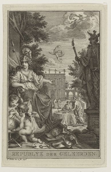 This engraving by Jan Caspar Philips, made in Amsterdam in 1755, offers an allegorical representation of Great Britain. Created during a period of shifting political power, marked by the union of England, Scotland, and Ireland, the print embodies the complexities of national identity and governance. Three crowned female figures sit harmoniously, representing England, Scotland and Ireland, holding their respective heraldic symbols, while putti play at their feet. They are framed by classical architecture, hinting at the Enlightenment ideals of reason and order. The detailed landscapes in the background evoke the distinct territories under British rule. But, while this idyllic scene projects an image of unified strength, it subtly acknowledges the tensions inherent in colonial power and the suppression of local identities. Consider how this image served to both celebrate and subtly obscure the realities of British expansionism. What stories are told, and what voices are left unheard?
