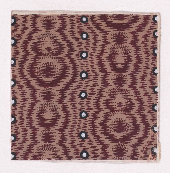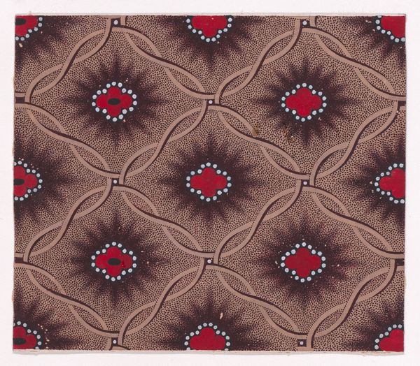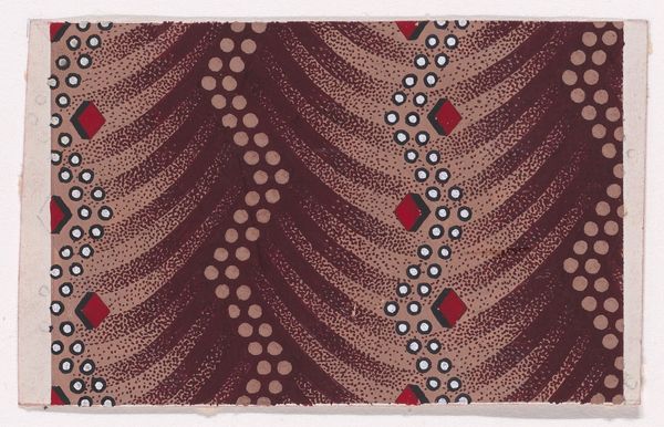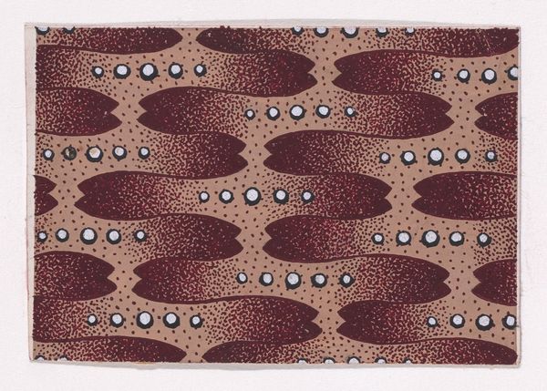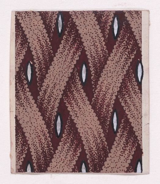 Curator: Let's take a look at this intriguing textile design from 1840, currently held here at the Metropolitan Museum. The piece, attributed to an anonymous designer, features a tiled background of alternating rectangular shapes, all framed by ribbons adorned with what appear to be pearls. Editor: Immediately striking! I’m seeing a complex interplay of geometric shapes. There’s something about that deep burgundy color that feels almost opulent, though in a strangely subdued way. I’m also noticing the meticulous detail, which gives the whole piece a very precise, almost mathematical feel. Curator: Absolutely. Consider the processes involved in creating such a design in the 1840s. Each line, each pearl, each textural element of those shapes required considerable handwork, suggesting a significant investment of time and skill from the artisan responsible. Were they working for a specific textile mill or as a freelance designer providing patterns to various manufacturers? Editor: It's that anonymity that gets me thinking. Who was this person? What social class did they belong to? Were they even recognized for their work at the time? These patterns, while seemingly decorative, are deeply embedded in the history of labor, of gendered expectations, of economic disparity. We need to explore who was able to consume these textiles, too, not just who made them. What did it mean to possess and display something like this? Curator: Good points! I wonder about the materials they used as well, the dyes in particular. How readily available was this color, burgundy, in the 1840s, and where might its constituent parts have come from? We might want to cross reference any production records of manufacturers known to trade locally at that time. Editor: And speaking of display, thinking about how textiles like this participated in world building and communicating status is central. What narrative about power and control do these kinds of luxurious textile patterns create within the context of broader colonial structures? Were they mimicking older traditions, or attempting something totally new? Curator: Excellent. I believe that the intersections of materials, labor practices, and markets hold just as much cultural insight. Editor: Agreed! Thinking about design and function intersecting with social factors helps paint a broader and more insightful picture of its context. Curator: Precisely! A richer and nuanced consideration of how we perceive an artwork and its origins. Editor: A perspective accounting for history, for craft, for societal impacts... for art, even beyond the art!