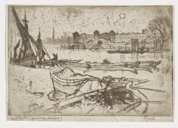 Curator: My first thought is how melancholic this cityscape feels. It's almost monochromatic, filled with misty light. Editor: And here we have "Dundee," an etching by David Young Cameron, created in 1890. The technique employs ink on paper, manifesting as a landscape but also verging on a cityscape theme. Considering Dundee’s significance as a jute manufacturing center in that period, what resonances might we find there? Curator: Ah, good point. It gives the image a sort of Victorian industrial vibe, even with the landscape elements. The tall ships feel ghostlike. You almost sense the sounds of the city in the background, overlaid with a kind of quietude. Does that make sense? Editor: Absolutely. It certainly draws attention to class structures and labor practices. The boats in the foreground are particularly poignant – what socioeconomic narratives might be read in relation to their scale or purpose within this urban structure? There is that wonderful interplay between the intimate foreground and the dominating, somewhat alienating city-line on the horizon. Curator: Right. And how he captures that hazy distance...the layers create depth but also a strange dreaminess. I keep coming back to the feeling of…resignation? The muted tones and the industrial backdrop speak volumes. I mean, for me it kind of asks whether progress always brings light. Editor: I see this etching as participating in broader art historical discourses – notably the late-Victorian aesthetic debates about the picturesque versus the industrial, the romantic versus the real. It’s less a literal transcription, but more a mediated, critical imagining. And I agree about your comments around the emotional register. Does it communicate potential or a prison? Or perhaps something oscillating between them? Curator: I love that. Oscillation. Beautifully put. Editor: Thank you. It highlights that artwork from Cameron are deeply layered texts, where individual affect meets broader societal and historical conditions. Curator: What a wonderful observation for us to close with. Thank you.