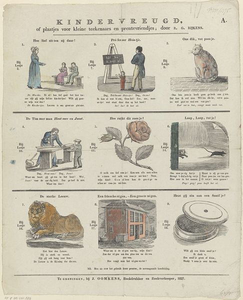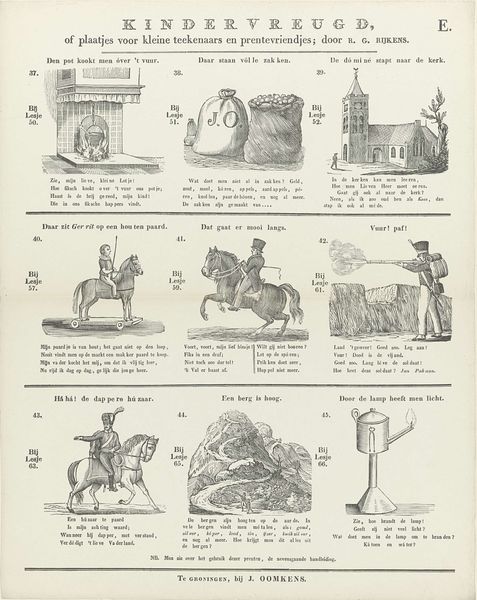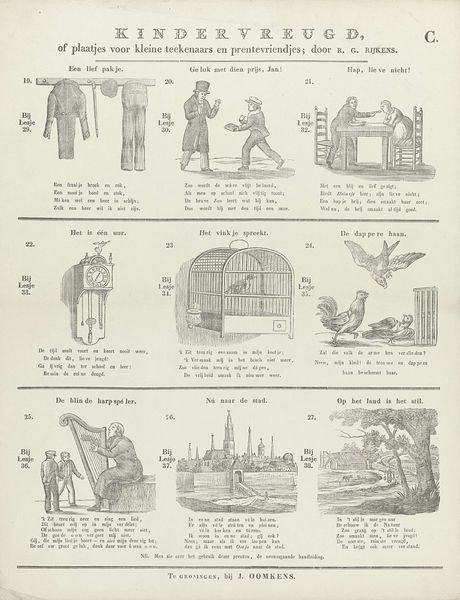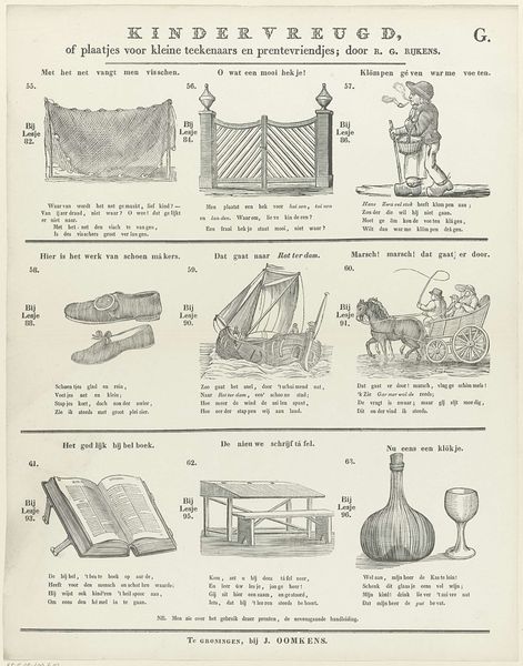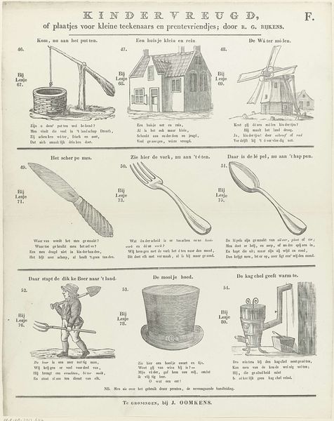 Curator: This broadside print, titled "Kindervreugd" or "Children's Delight," is by R. G. Rijkens and was printed by Jan Oomkens between 1808 and 1844. I am intrigued by the fact it’s a print meant for children that depicts objects of everyday life like a pocket watch, an inkwell, and a ladder, almost like a visual catalogue. It’s simple and charming but makes me wonder, what purpose did these images serve beyond simple amusement? Editor: It's true; there's a childlike quality to it that immediately makes you smile. I wonder how such images functioned in children’s lives two centuries ago. How would a materialist lens analyze this work? Curator: Well, let's think about the context of production and consumption. This wasn’t some precious painting, right? It's a mass-produced print. Engravings like this were relatively affordable. So, who was buying them and for what purpose? It gives us insights into the growing culture of childhood literacy and domestic education, and the rising middles class in the Netherlands. Editor: So the availability of prints signifies a shift in how children were perceived and educated? Curator: Precisely. Before widespread printing, access to images and texts were very limited. The use of common materials—paper, ink—transformed into a social tool, designed to educate and shape young minds. Editor: It’s fascinating how analyzing the materiality and context unlocks layers of meaning about education and societal values. Curator: Yes, and that's just the beginning. Consider the labor involved – the engraver, the printer – each playing a role in bringing these ideas to a broader audience. By considering it, it becomes a fascinating artifact reflecting both artistic practice and societal structures. Editor: Thanks. Thinking about the economic process really shifts how one views the piece. Curator: Agreed!