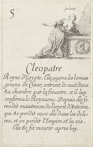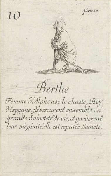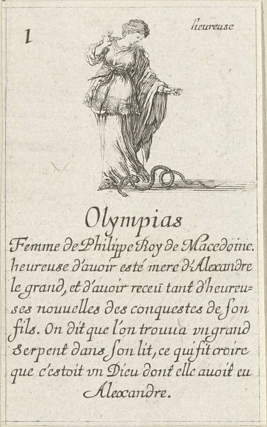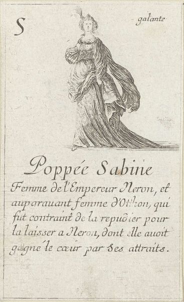 Stefano della Bella made this print of Vibia Sabina on paper in the 17th century. The print is reminiscent of playing cards, which were gaining popularity in Europe at the time. The inscription below the figure identifies her as the wife of Emperor Hadrian, who avoided conception out of hatred for her husband, as she didn't want anything of him to be born of her. The print was made in France during a period of political and social upheaval. France was undergoing a period of economic hardship and religious conflict, which led to widespread social unrest. Prints like this one can tell us a lot about the history of gender, marriage, and the circulation of gossip. By studying archival sources such as letters, diaries, and legal documents, we can gain a deeper understanding of the social and cultural context in which this image was created.