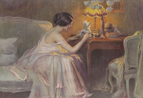 Editor: Here we have Giovanni Boldini's "The Letter" from 1873, crafted with watercolor. The fluid brushstrokes and muted tones give it such an ephemeral, fleeting quality, like capturing a moment in a dream. What can you tell us about this painting? Curator: It is important to consider that Boldini painted this in Paris, and in the same year as the formation of the Société Anonyme des Artistes Peintres, Sculpteurs et Graveurs, which held what we now recognize as the first Impressionist exhibition the following year. This milieu influenced his movement away from the traditions of formal academic portraiture, yes? Boldini's image-making shifts from being predominantly bourgeois, with the figures assuming static, posed stances, to become one of aristocratic women who perform acts of reading and letter-writing in intimate interiors. In what ways might we read into Boldini's depiction of female domesticity? Editor: I'm drawn to the ambiguity of the scene; are they receiving bad news? Sharing a secret? The women almost blend with the patterned wallpaper, making me think about women's roles in the late 19th century, confined to the domestic sphere, and their own communications networks and secrets. Curator: Precisely! This painting reflects a moment where the private lives of women, traditionally hidden from the public eye, become a subject of artistic exploration. The act of reading, and of corresponding through letter writing, assumes enormous social significance as integral features in maintaining feminine contact. How does it reflect broader cultural trends around gender and class in that era? Editor: The more I look, the more I see "The Letter" as a document of a very particular time and place, one with changing social norms. Curator: Exactly. Art like this doesn't just depict, it participates in the ongoing discussion about society and our evolving relationships.