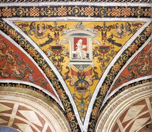 Curator: The Rinuccini Chapel, dating to about 1370 and frescoed by Giovanni da Milano. What strikes you immediately about the materiality here? Editor: The surface feels alive. The intense blue, scattered with stars like hammered metal, it creates this impression of a vast night sky, meticulously crafted by hand. I imagine the repetitive labor involved. Curator: Indeed. The blue functions as a firmament. Consider the structural elements at play—the geometric rigor of the ribs against the expansive azure. The organizing principle of the cross dominates. The placement of figures seems almost incidental. Editor: Almost incidental? Those figures look very precisely placed to me. And notice the figures with text, illuminated with what looks like gold leafing. Do we know where that came from? This could tell us much about who this chapel was built for and what access they had. Curator: Perhaps. But I'm drawn to how these narrative details interact with the larger visual architecture of the space. Note the symmetry and the careful orchestration of color; consider how light must have filtered in. The artist manipulates space and symbol to guide devotion. Editor: Devotion takes work. The physicality of applying those gold stars, the intense planning required for frescoes… and it all had to align with available resources. How many assistants were involved, and what were their roles? This work required labor on so many levels. Curator: An interesting counterpoint, highlighting the confluence of intention and craft within the piece’s architectural framework. Editor: Ultimately, seeing how materials meet ideas is what brings these surfaces alive for me. Curator: For me, it's where those two dimensions transcend one another that true art emerges.