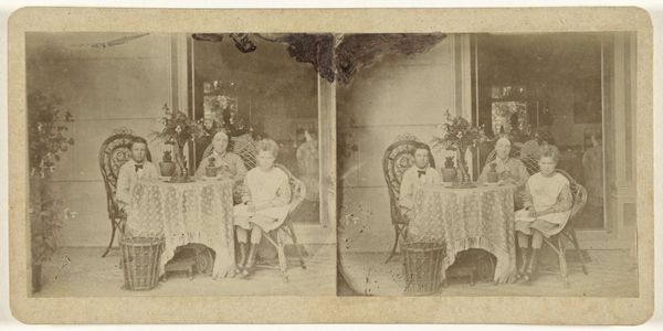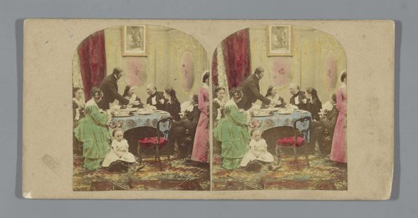 Editor: This gelatin-silver print, "Gezelschap rond eettafel" by an anonymous artist, made sometime between 1855 and 1875, depicts a gathering of people around a dinner table. The scene feels incredibly staged, almost like a tableau vivant. What are your initial thoughts when you look at it? Curator: The staged quality is key. I'm immediately struck by the power dynamics on display. The stiff poses and formal attire, especially the man at the head of the table in his dark suit, underscore the rigid social codes of the era. The presence of the child kneeling adds another layer – she is both present and subservient. Where do we see that represented today? Editor: Subservient, that's a strong word. Is she perhaps just playing on the floor? Curator: Perhaps. But think about the broader context. Photography in this era was often used to reinforce class structures. This image seems to reinforce gender roles too. Notice how the women are clustered together. Is that simply circumstance or something else at work? Editor: I see what you mean about the power dynamics. I didn’t catch that at first. The composition seems very deliberate now that you mention it, with the child literally at the bottom, almost outside the circle of adults at the table. Curator: Exactly! And look at the objects on the table - perhaps a record of class standing or trade symbols? What narratives can we construct looking at the placement of people and objects in this image? Editor: This has completely changed how I see this photograph! Thank you for shedding light on the power dynamics and social context, I wouldn't have thought to consider it this deeply on my own. Curator: Art is rarely created in a vacuum. Thinking critically about its origins and intentions only enriches our understanding. This seemingly simple image offers a complex lens into the social structures of its time and that informs our world, too.