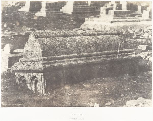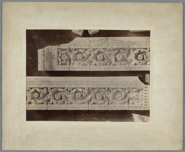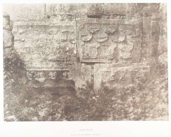 Editor: This is an albumen print by Auguste Salzmann, taken sometime between 1854 and 1859. It’s called *Jerusalem, Vallée de Hinnom, Details de la frise de la retraite des Apôtres*. Looking at this frieze, I am immediately struck by how meticulously it has been captured with the medium of photography. What details jump out at you? Curator: Observe the interplay between the rough, unprocessed rock above the frieze and the carved forms in the decorative register below. The contrast is visually very stimulating. Salzmann emphasizes these juxtapositions via the tonal range inherent to the printing process; notice, especially, how each module is slightly different in tonality. This tonal contrast guides the viewer’s eye rhythmically from left to right, as if performing a linguistic reading. Do you agree? Editor: That's fascinating! It seems that he wasn’t merely documenting; he was composing through contrast and tonal relationships, not unlike how a painter manipulates light and shadow. So, you see the materiality of the albumen print itself as an integral element of the work's meaning? Curator: Precisely. The very substance of the photographic print – its textures, its capacity for nuanced grayscale – dictates the visual experience and thus informs our understanding of the architectural elements it depicts. Further, by orienting our eyes laterally from form to form, he allows us to study its design elements up close. It would not read as coherently, I would argue, in person. Editor: I had never thought about how the photographic process itself adds so much to the understanding of architecture. Thanks! Curator: And thank you for your astute observations. Paying attention to such details, such as tonality, enables deeper engagement with artworks.