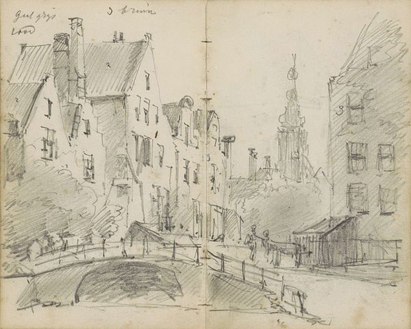 Curator: Welcome. We are looking at “Dorpsgezicht met figuren en een kerktoren,” or “Village View with Figures and a Church Tower” by Willem Koekkoek, created sometime between 1849 and 1895. It’s currently held here at the Rijksmuseum. Editor: My immediate impression is the sketch’s raw energy, even the open sketchbook format. It's intimate, like we're glimpsing the artist’s personal process. Curator: Indeed. Koekkoek was known for his idealized cityscapes, but this drawing offers something more grounded. It's a study, perhaps a preparatory work. Look at the pencil strokes, how they build the forms and capture the light. It speaks to the working methods of artists in that era. Sketchbooks were not only for planning but also important parts of the art-making production and distribution. Editor: I'm particularly drawn to the church tower dominating the composition. Churches were powerful symbols within Dutch society. By placing it prominently, Koekkoek acknowledges the social fabric of this village, especially given the economic power and moral authority churches enjoyed at that time. Curator: Exactly. While the sketch captures a realistic depiction of a village scene, we need to consider the artistic choices he’s making. Koekkoek came from a family of painters. His family had specific painting styles that became products on the market, to meet an audience demand for landscapes in a certain style. The church tower isn’t just a building; it is also representative of those dynamics. Editor: What I appreciate here is how this seemingly simple sketch reflects the intersection of art, social structures, and economics. The artist, materials, the way it represents places that shape how a piece of art will be perceived by the public… Curator: It’s fascinating to consider how the production methods and the social context intersect. Thank you. Editor: Thank you, this was insightful.