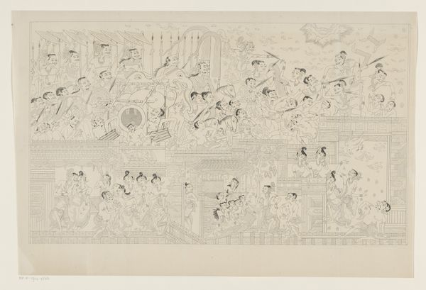 Editor: We’re looking at “Sketch Sheet with a large number of figures” by Jan van Ravenswaay, made between 1799 and 1869, using pencil, pen, and ink on paper. The sheet is filled with numerous small figures engaged in various activities. It almost feels like a snapshot of a bustling town square, capturing these fleeting moments. How do you interpret this compilation of sketches? Curator: The compositional arrangement presents a challenge to conventional readings of depth and narrative. The figures, though representational, lack a unifying perspectival system. Note how the artist dispenses with establishing a clear ground plane or horizon line; each figure exists almost independently. This fragmentation invites us to consider the drawing not as a unified scene, but as a study in form and gesture. Editor: So you're saying it's less about the story and more about how the artist explores form and movement? The figures certainly seem active. Curator: Precisely. Observe the dynamism in the line work; the varying line weights suggesting the movement and energy. Notice how the figures seem almost captured in mid-action. It prompts us to ponder the artistic process: Was this sheet for planning larger, formal paintings or autonomous as an exercise in capturing transient moments? Editor: It's like a visual record of the artist’s observations, where each figure is a self-contained study. It does highlight a fascinating focus on pure form and gestural line. Curator: Exactly. Consider then how van Ravenswaay employs the visual language of line and form to present these characters as distinct aesthetic experiences. Rather than narrative coherence, this piece excels in showcasing diverse form and captured energy through gestural expressions. Editor: That completely changes my perspective on this sketch. Now, I’m not so focused on finding a story, and instead appreciating the variety and skillful rendering of each individual figure. Curator: Indeed. By analyzing the drawing's formal elements—its line, composition, and arrangement—we gain insight into the artist's intentions and aesthetic sensibilities, and challenge our own expectations of pictorial representation.