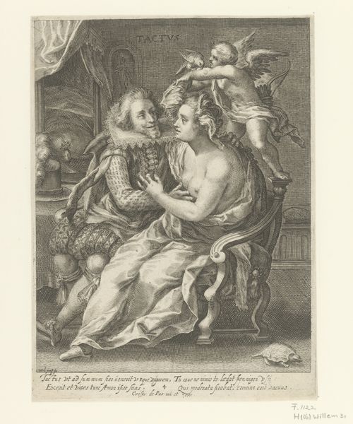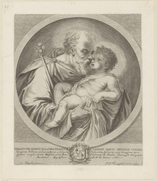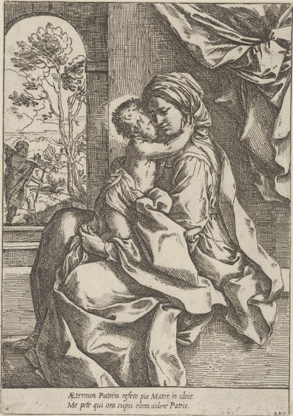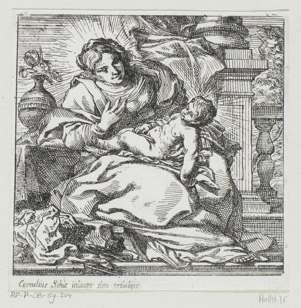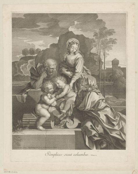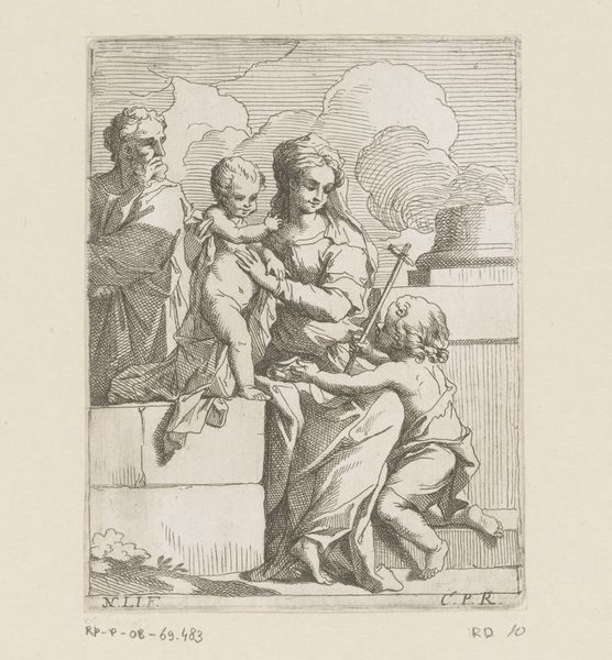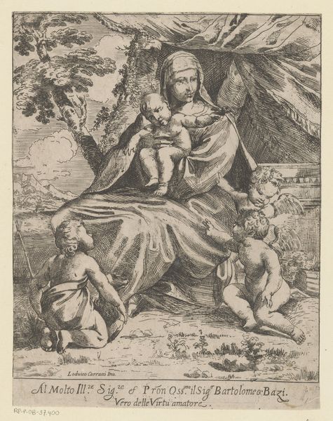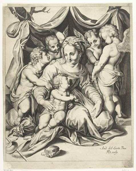 Editor: So, here we have Elisabetta Sirani's engraving, "Maria met Kind en de jonge Johannes de Doper," made between 1648 and 1665. The intricate line work gives it an ethereal, almost dreamlike quality. What catches your eye in terms of formal elements? Curator: The first thing that strikes me is the interplay of line and form. Notice how Sirani employs varying densities of hatching to model the figures, creating volume and depth within a relatively flat plane. This masterful use of line, typical of engraving, establishes the tonal range and dictates the viewer's eye movement across the composition. Editor: It’s interesting how she creates shading with just lines. How does the composition contribute to the overall impact? Curator: Observe the circular format; it immediately contains the scene, focusing our attention on the central group of figures. The arrangement—Mary at the apex, anchoring the two infants—forms a stable, triangular composition, yet it's dynamic. The figures intertwine, their limbs creating a sense of movement. Do you perceive a relationship between the foreground and the detailed drapery behind them? Editor: I see it now, the fabric provides depth despite everything being very linear and the curves softens the shapes. What do you think that the relationship creates? Curator: The fabric forms the pictorial architecture supporting the holy figures in foreground. So, Sirani seems invested in pure aesthetics, orchestrating tonal contrasts, textures, and spatial relationships within the frame. This is more than mere reproduction; it is a carefully constructed pictorial space, one that allows the viewer's eye to luxuriate in the delicate dance of lines and forms. Editor: This new appreciation makes it feel much more than just an image, now that I understand her conscious formal decisions. Thank you. Curator: Indeed. Attending to line and shape opens doors into unseen aesthetic richness.