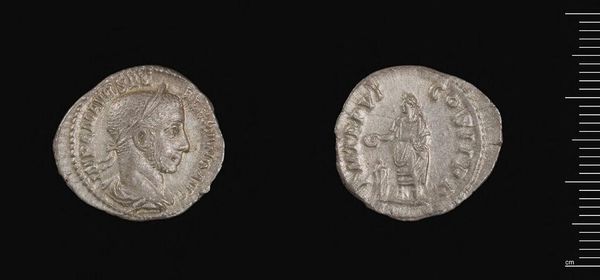 Editor: This is a Denarius of Septimius Severus, a small silver coin. It feels weighty despite its size, and the images are incredibly worn. What can you tell me about the figures depicted on this coin? Curator: These coins are powerful icons. The portrait of Septimius Severus presents not just his likeness, but also his authority, linking him to a lineage of power. Who do you think the other figure could be? Editor: I suppose a goddess? Curator: Yes. These symbols speak volumes about how rulers wished to be perceived, linking themselves to divine power and promising prosperity. The image becomes a tool of cultural memory. Editor: So it's less about the actual value of the silver, and more about communicating power. Fascinating! Curator: Precisely! A pocket-sized piece of propaganda, if you will. A lasting symbol of the emperor’s reign.