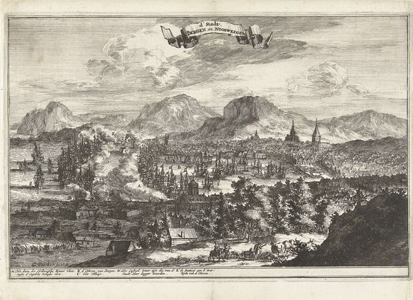 Editor: So, this is Giuseppe Vasi’s “Panorama van de stad Rome,” an etching and engraving from 1765. It's incredibly detailed! What really strikes me is the sheer density of the urban space juxtaposed with the vast openness of the landscape. What do you see in this piece? Curator: Beyond the beautiful detail, I see a deliberate statement about power and perspective in 18th-century Rome. This isn't just a cityscape; it’s a carefully constructed image of dominance. Notice the elevated viewpoint? It places the viewer—presumably a wealthy patron, likely a tourist, perhaps part of the elite Grand Tour set—in a position of authority, overlooking and, in a sense, owning the city. Consider how the linear perspective draws your eye into the heart of Rome, emphasizing the control and order imposed upon the landscape and its people. What about the wisps of smoke in the mid-ground. Do you have any thoughts about those? Editor: The wisps of smoke seem…theatrical almost, drawing the eye, like a dramatic spotlight. Does that point back to your thought of carefully constructed imagery of the city? Curator: Precisely. It reminds us that Rome, even then, was a spectacle, designed to impress. And who does this spectacle serve? Consider the vast inequality embedded within the city. While the wealthy could commission and enjoy such panoramic views, what was the lived experience of those in the densely packed, unnamed buildings? It pushes us to consider whose stories are prioritized and whose are silenced in these grand narratives of place. Editor: I never would have considered the point of view as a conscious display of power. That completely changes how I look at this piece. Curator: Exactly! It's about deconstructing the intended message to uncover the power dynamics at play. So, what do you make of it now? Editor: It definitely feels less like a neutral landscape and more like an assertion of control and a complicated historical narrative, really eye-opening. Thank you!