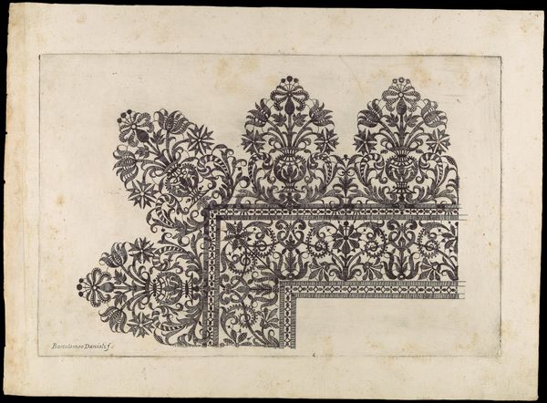 Editor: This is "Corona delle Nobile et Virtuose Donne, Libro Terzo, page 10 (recto)," a 1620 engraving by Cesare Vecellio. The intricate line work creates a mesmerizing pattern. How do you interpret this work? Curator: Well, looking at the means of production is key here. This wasn’t “high art” destined for a gallery wall. Engravings like this served a practical purpose. Vecellio was offering designs, templates essentially, for lacemakers. Editor: So, it’s functional art? More craft than fine art, maybe? Curator: Exactly. The emphasis shifts from the artist’s individual genius to the skilled labor of the women who would then execute these designs. It questions that separation of 'high' and 'low' art that often dominates art history. Notice the detail. Editor: Yes, I can see how time-consuming the process of creating something like that would be! What impact did readily available prints like this have on lacemaking and textile production? Curator: This image highlights how reproductive technologies changed production. Patterns became widely disseminated, influencing styles and techniques across different workshops and regions. This allowed for a kind of mass production of design, which then would influence consumption and markets. This forces us to look at who controlled these patterns, and therefore the product they helped produce. Editor: It’s like early clip art for textiles. I see the connections you're making between material, process, and social implications. Thank you! Curator: Precisely. Recognizing these connections offers an expansive understanding of the object’s creation, role, and significance beyond aesthetics.