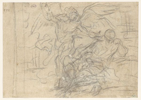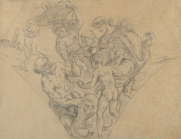 Editor: So, here we have "Battle Scene with a Prisoner Being Bound, after Raphael," a pencil drawing by Eugène Delacroix from around 1823. It’s chaotic, right? Bodies twisted, energy crackling even in a sketch. It feels… raw. What leaps out at you when you look at this, what do you make of it? Curator: Raw is the word. But also, so beautifully restless, don’t you think? Delacroix wasn’t just copying Raphael; he was channeling him, almost wrestling with the old master’s energy. I see a young artist testing his own muscles, his own vision, against a giant. Notice how he focuses on the human form—not idealized beauty, but dynamic, straining bodies. You feel the effort, the struggle. And I suspect a young artist saw a bit of himself in it all. The "prisoner being bound," trapped by expectation maybe? Editor: That's an interesting read! It makes me wonder if Delacroix’s struggles with the canon echo in the way he's rendered these figures... Did Romanticism, with its emphasis on emotion, invite this sort of visceral response to earlier works? Curator: Absolutely! It was like saying, “The classics? Wonderful, but what do *I* feel when I look at them?” It’s a deeply subjective, almost confrontational approach. You know, it’s less about historical accuracy, and more about a present-day experience. In a way, Delacroix wasn't just sketching a battle scene, but was battling with art history itself. Who won, I wonder? Editor: Ha! A never-ending battle, maybe? This has really changed my perspective on copies. I’ll look at them differently from now on, searching for those hidden dialogues. Thanks for your insights! Curator: My pleasure! Art history, just like art itself, thrives on such passionate reinterpretations. And the conversation keeps going, it has to, right?