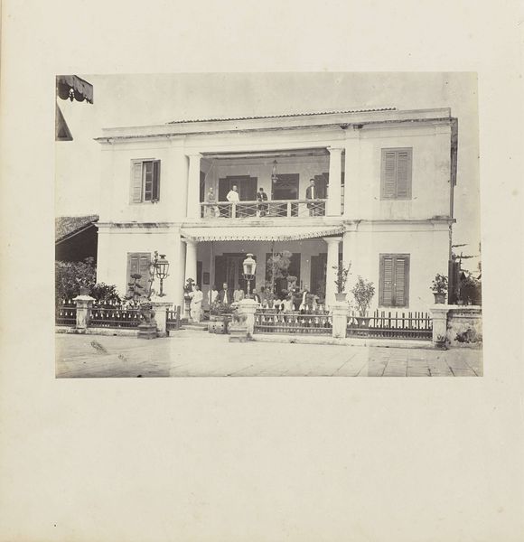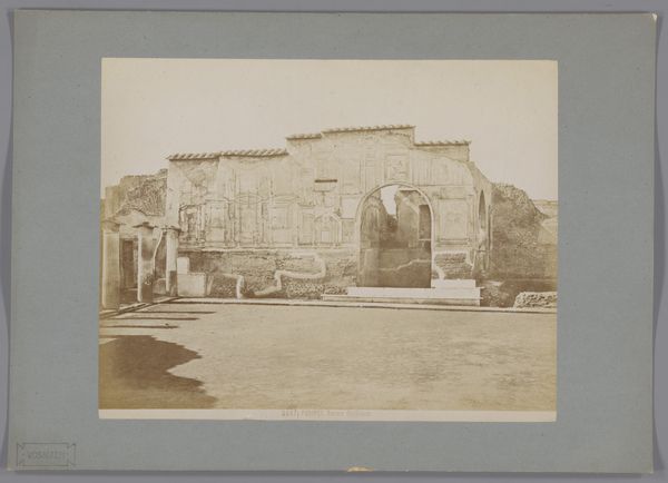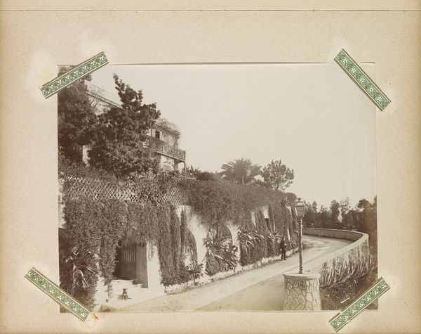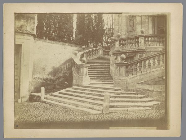 Curator: Let’s consider this photographic print from around 1875-1900. It’s attributed to Gustave Eugène Chauffourier and titled, tentatively, "Garden of a Villa (presumably) in Tivoli". Editor: Immediately I see a theater of class, a very romantic display of wealth and leisure. Look at the carefully positioned sculpture within its alcove, partially obscured. There is something undeniably melancholic in the aged quality of the scene and in the almost theatrical, staged perspective of it. Curator: Absolutely. Albumen prints like this were fashionable ways to document sites encountered during the Grand Tour, solidifying cultural capital. Tivoli, near Rome, with its gardens and classical ruins, became a popular destination during this period, attracting European elites. Editor: The terraced structure of the garden is significant, isn't it? Each level creates a hierarchy of visibility and privilege. It reminds us of how power and control are manifested in landscape architecture. I wonder what voices are excluded from this romantic vision? Who toiled to maintain it? Curator: An important point to remember. This is not just an innocent landscape; it’s a curated image of a specific social class. Consider how photography, even in its early stages, played a role in constructing and reinforcing such notions of taste and social standing. Editor: Precisely. And the choice of statuary – classical figures, almost certainly – evokes a deliberate link to an idealized past, a narrative of European supremacy rooted in ancient civilizations. A very potent symbolic vocabulary. Curator: Yes, the romantic undertones speak volumes, contrasting the built structure and naturalistic elements to create a picturesque, but very artificial ideal of the "natural". There's also the implicit statement about the villa owner's erudition. The Grand Tour, you'll recall, was itself considered an essential rite of passage for those who could afford it. Editor: In seeing through this, we might better question how seemingly innocuous depictions can reflect power dynamics and reinforce structures of inequality that persist today. Curator: A keen point. Thinking critically about works such as this urges us to look beyond their face value. Editor: And perhaps ask what type of alternative landscapes might arise by offering visibility and giving power to a different point of view.